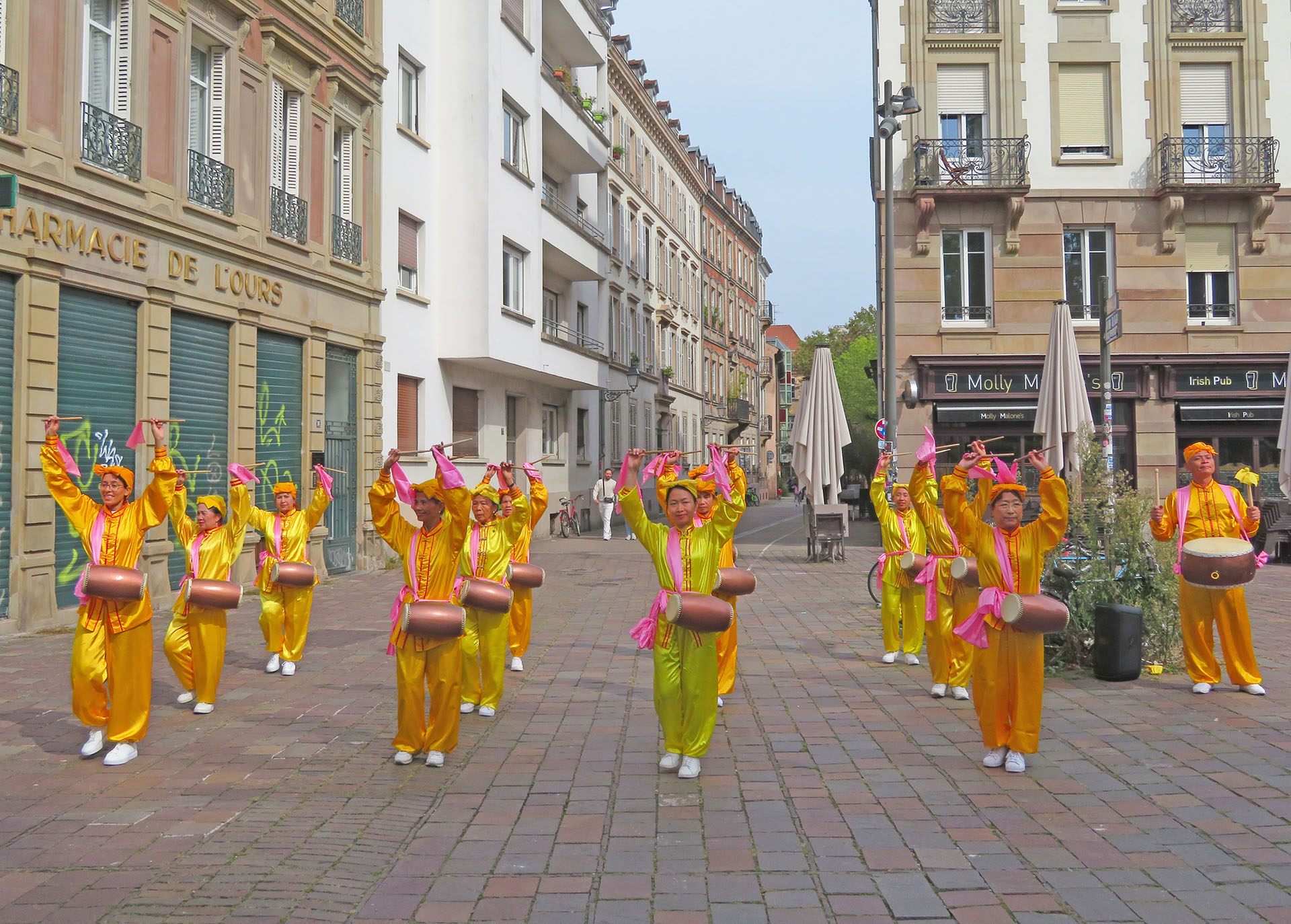 图10~11:法轮功学员在斯特拉斯堡奥斯特利茨广场表演腰鼓和法轮功功法演示。