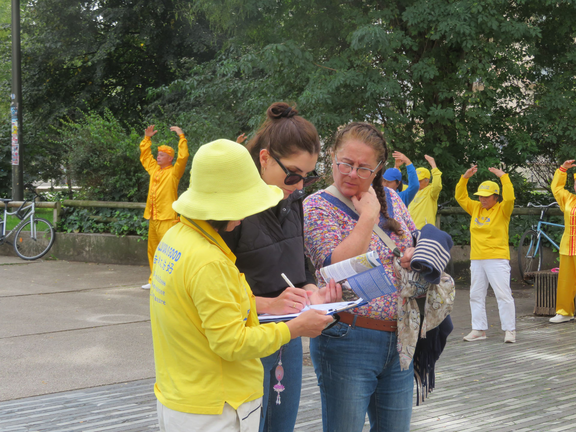 索菲亚(Sofia)是斯特拉斯堡大学英语系学生,学习英语和日语。她在反活摘请愿书上签字后说:“得知今天在中国这样的国家,还有这样的迫害,拿他们(法轮功学员)发泄私愤,这是绝对恐怖的。我认为要让他们炼功,特别是法轮功这样的功法,不伤害任何人,看见他们炼功,极其舒缓。”索菲亚认为,真、善、忍是很重要的价值,看见法轮功学员,她极大地感受到了这样的价值,在展位,她也感受到善和耐心。她说:“为了这些价值,人们应该坚持努力!”