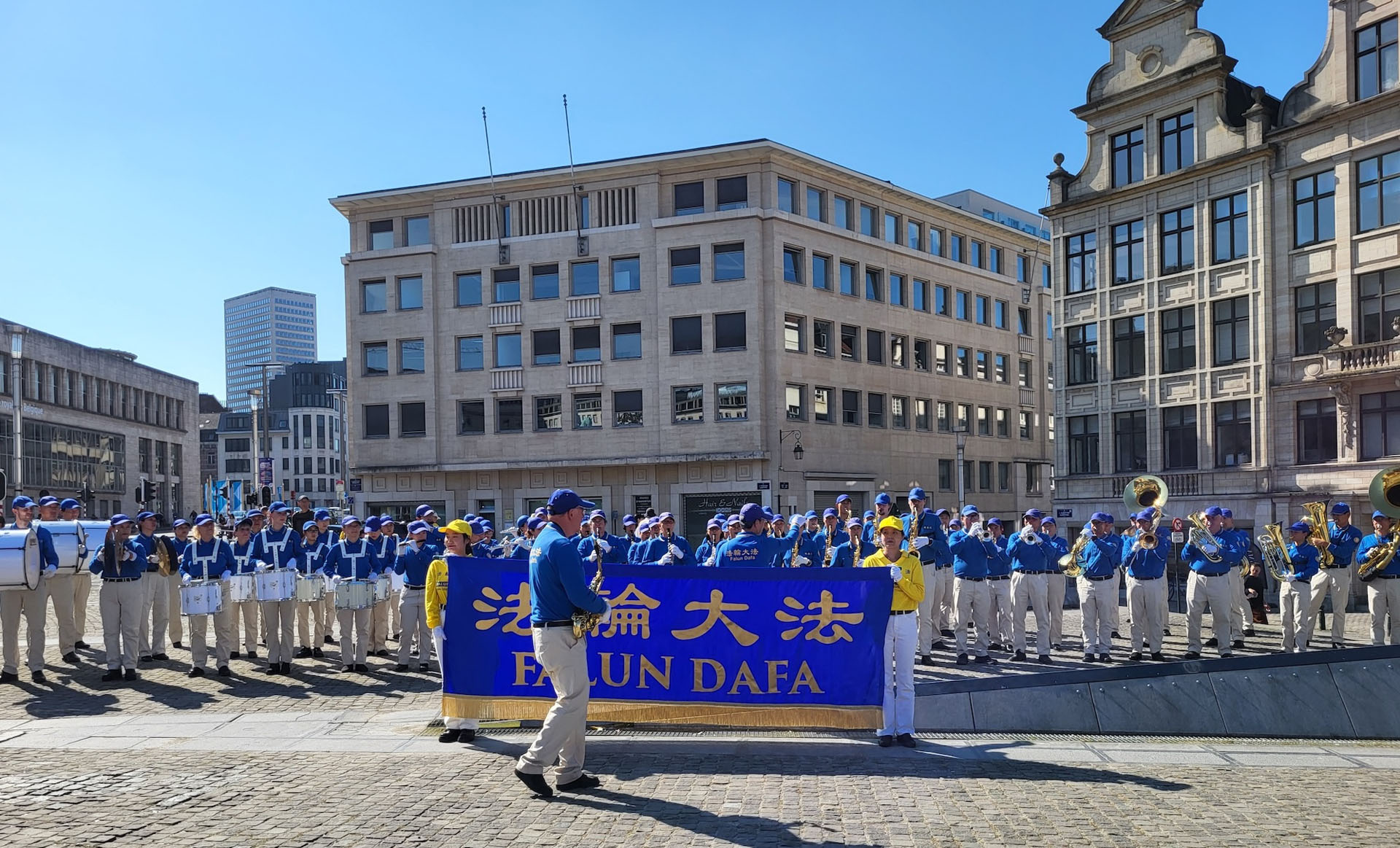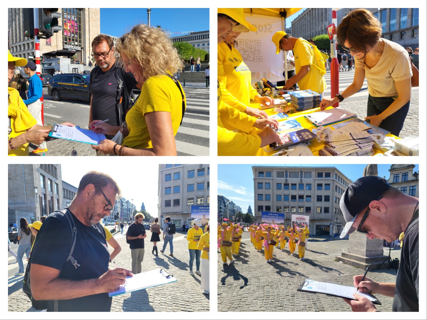 上午时分,在艺术山旁的布鲁塞尔五十年宫公园(Parc du Cinquantenaire)里,欧洲学员们展示了法轮功的五套功法。雄伟的五十年宫建筑近旁的草坪上,绿茵茵青草衬托身着黄色炼功服的法轮功学员,格外引人注目。五十年宫是布鲁塞尔的地标之一,为纪念比利时独立五十周年而修建的。 下午,法轮功学员在市中心的布鲁塞尔艺术山讲真相。周边是漂亮的花园区以及比利时皇家图书馆(KBR)、布鲁塞尔广场和国家美术馆。法轮功学员们以修炼人积极乐观的慈善心态,向民众介绍真善忍、揭露中共迫害。围观的民众络绎不绝、流连忘返。