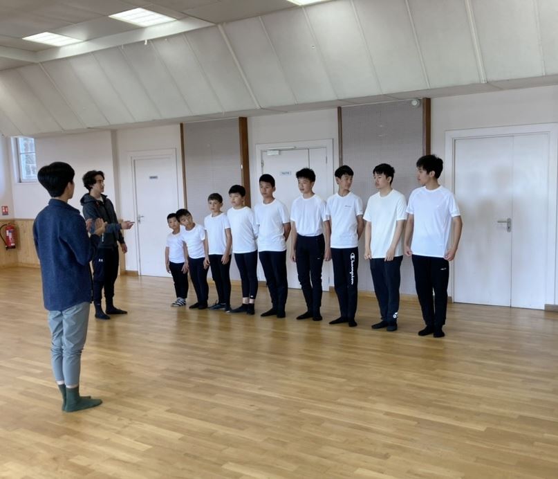'图5:男大法小弟子在舞蹈训练中做形体训练。'