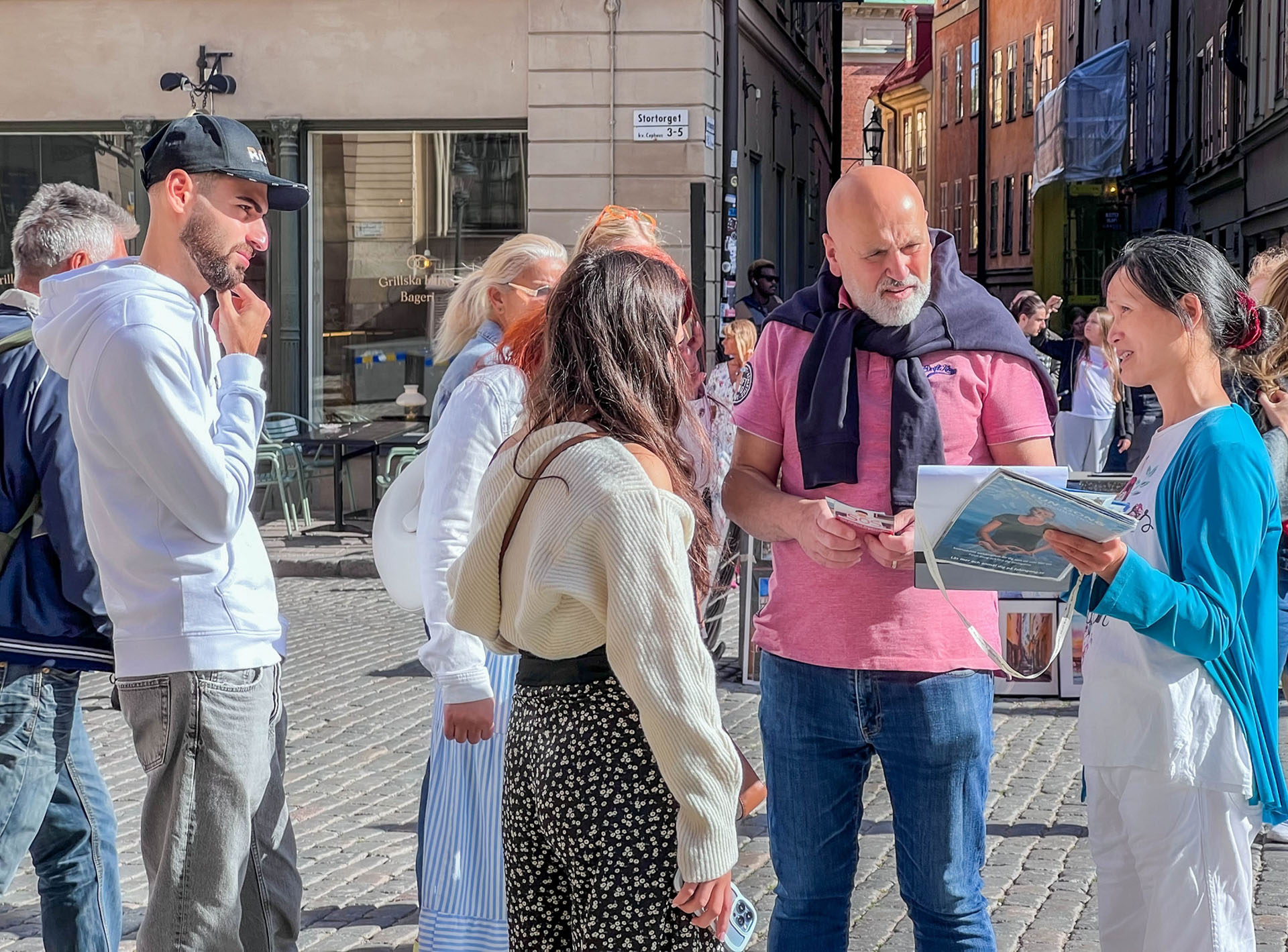 ![]() 图6~8:法轮功学员在诺贝尔博物馆前举办的真相活动中,面对面向世界各地游客讲述法轮功真相。华人连连称赞“太棒了!” |