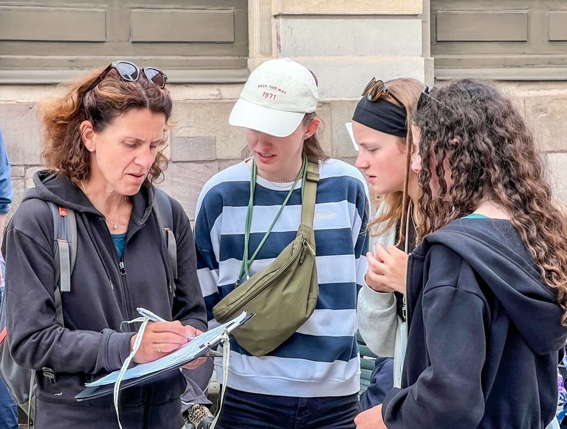 在博物馆前喧闹的小广场上,法轮功优美的炼功音乐、宁静祥和的炼功场面,以及醒目的横幅、真相展板,吸引着众人的目光。人们都主动接资料、观看展板或与学员交谈,有不少人对功法感兴趣,当场学炼功法动作。