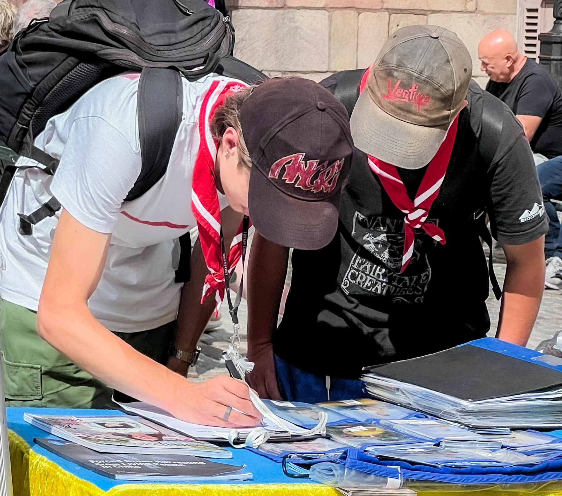 法轮功真相展位格外引人瞩目,吸引许多人前来了解真相,明白真相的人们紛紛签名支持反迫害,有大陆游客发表感言:盼中国人赶快清醒,中共尽快解体灭亡!