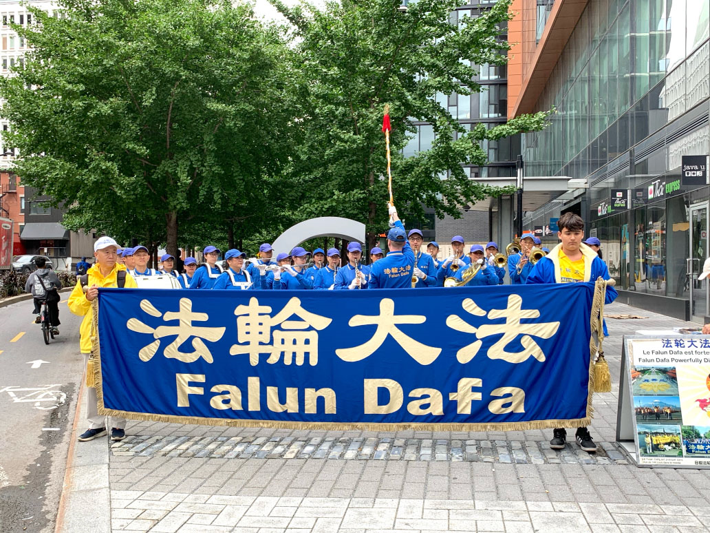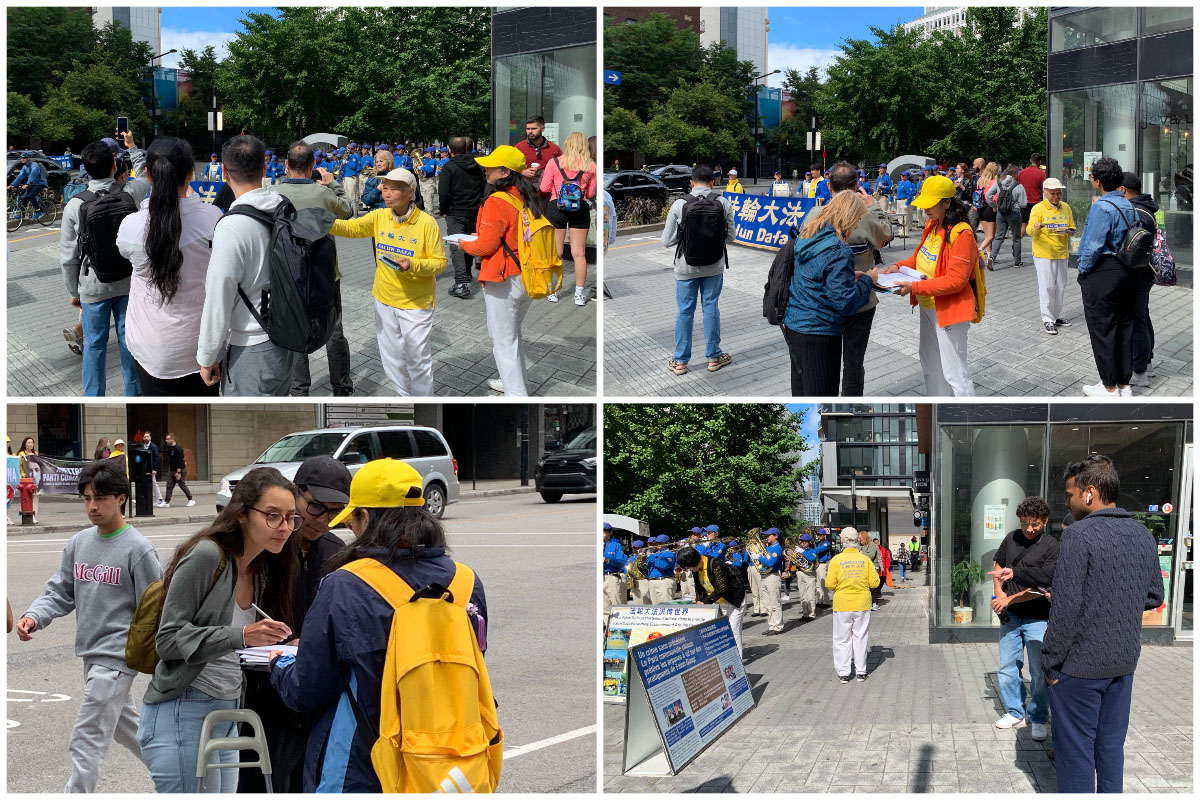 在市中心繁华地带——圣凯瑟琳大街的康可迪亚大学校区路口,法轮功学员拉开“法轮大法好”、“停止迫害法轮功”等横幅,现场摆放有法轮功弘传世界、中共迫害法轮功、活摘法轮功学员人体器官等内容的真相展板,法轮大法天国乐团成员的演奏与集体炼功交替进行,场面祥和纯正。