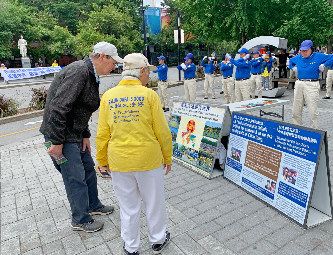 市民罗德里格(Rodrigue)对法轮功学员表示:“我是一名基督徒,当年基督徒也是经历迫害走过来的,今天法轮功学员的抗争也是这样。共产党试图用他们的意识形态,压倒你们,还想渗透世界,但他们不会赢的。我的心和你们在一起,我支持你们。”