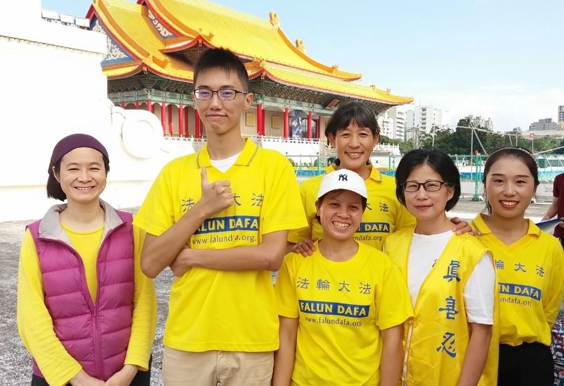 图1:宇哲(左二)在中正纪念堂与腰鼓队的学员(由部分法轮功学员组成)合影。