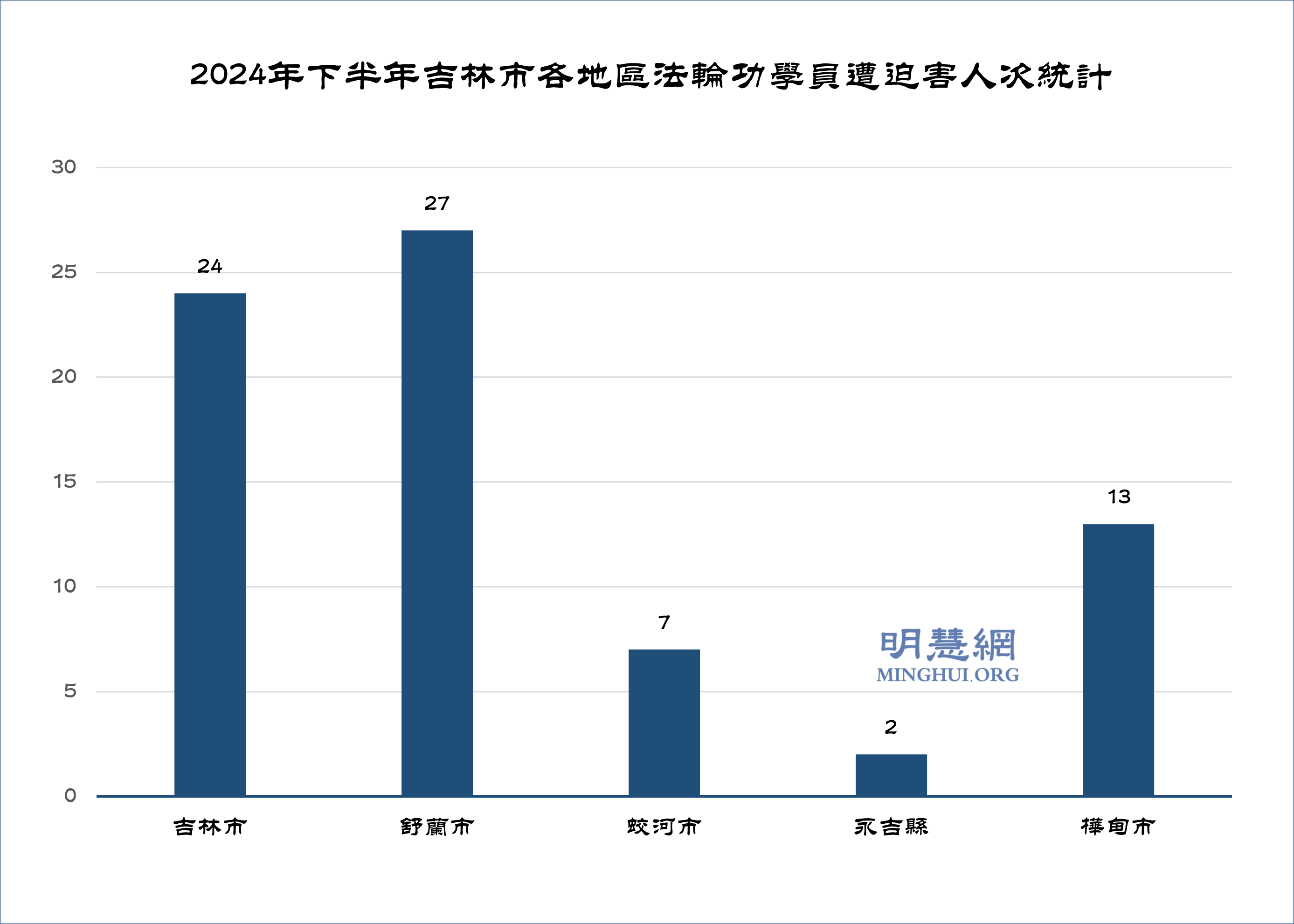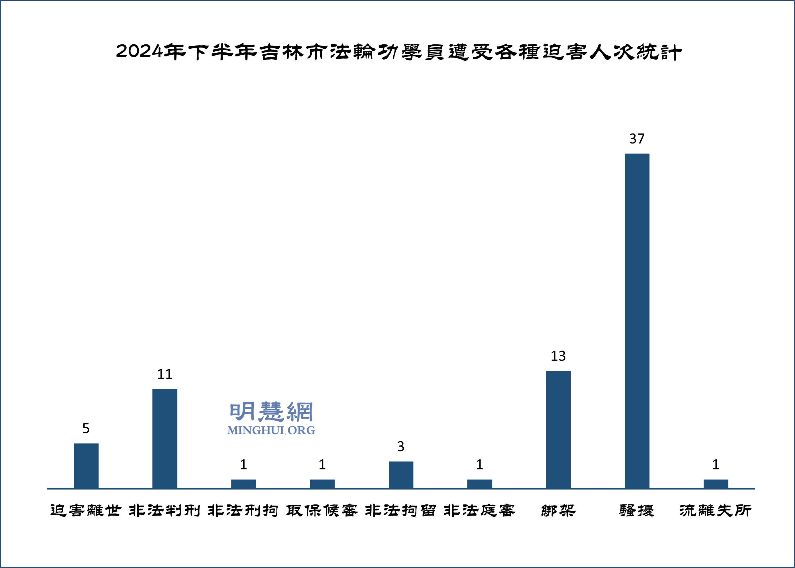 ![]() 图1:2024年下半年吉林市法轮功学员遭受各种迫害人次统计 |