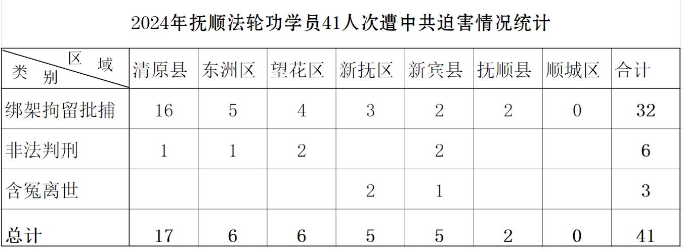 【明慧网二零二五年一月十五日】(明慧网通讯员综合报道)据明慧网资料获知,辽宁抚顺市法轮功学员在二零二四年间遭受中共迫害至少41人次,被绑架拘留批捕32人,离世3人、诬判6人其中4人被法院非法罚款46000元。