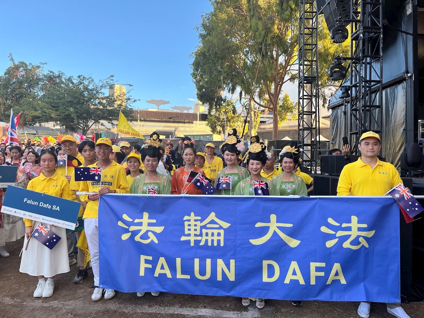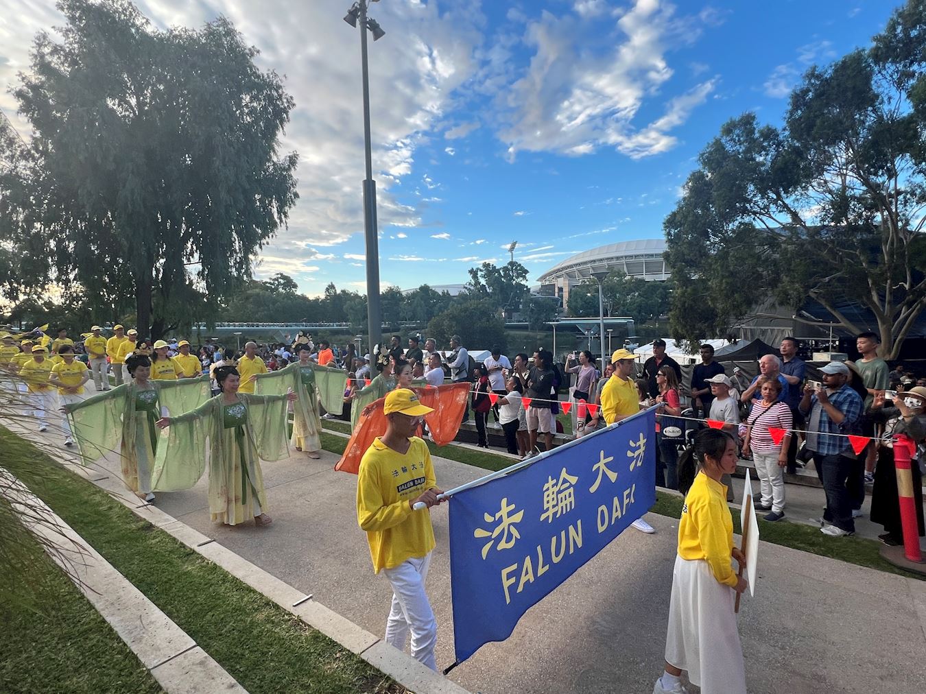 游行队伍从椭圆体育场出发,延连结著名的节日剧场的天桥到达艾德尔公园(Elder Park)庆典场地,当介绍到法轮功队伍时,众人鼓掌欢呼。