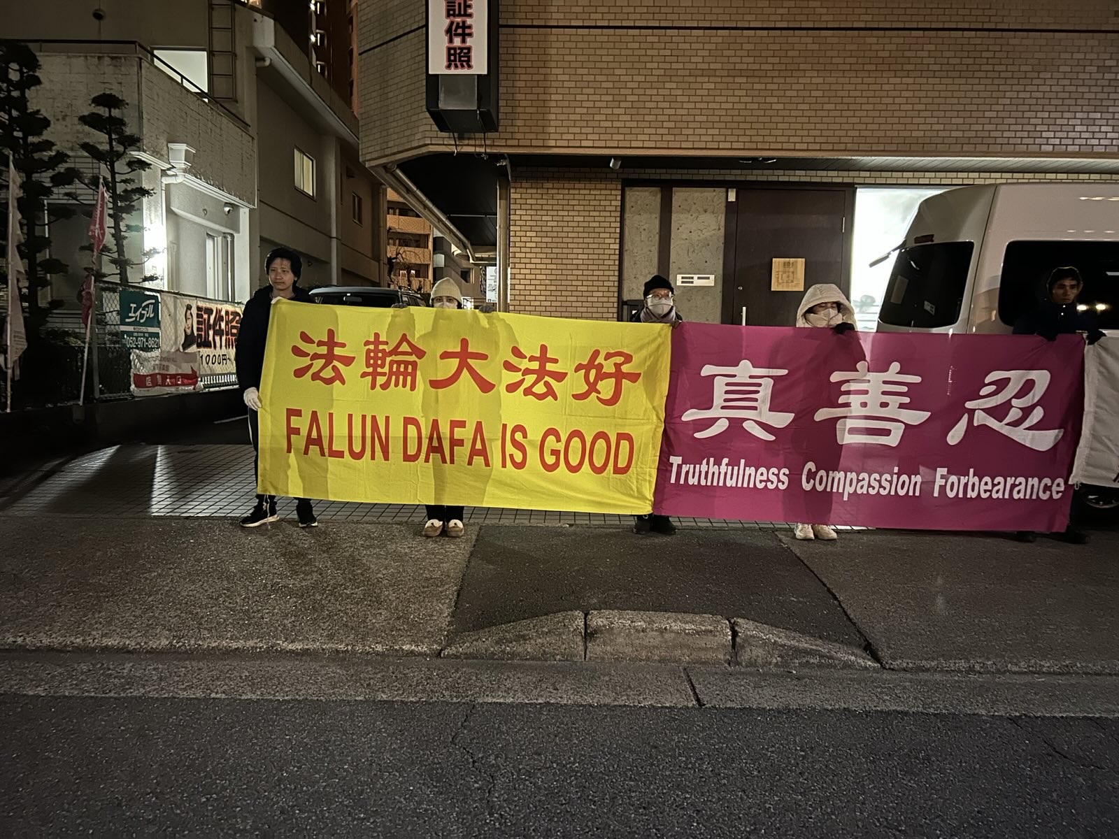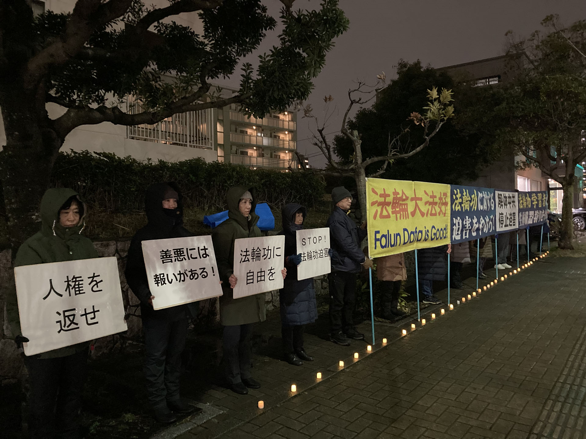夜幕降临,在熊本的福冈中领馆前,白天的雨水变成了冰冷的雪花,飘落在横幅和学员们的肩上。在风雨交加中,点点蜡烛的光辉和醒目的横幅、标语牌吸引了很多行人和车辆的关注。