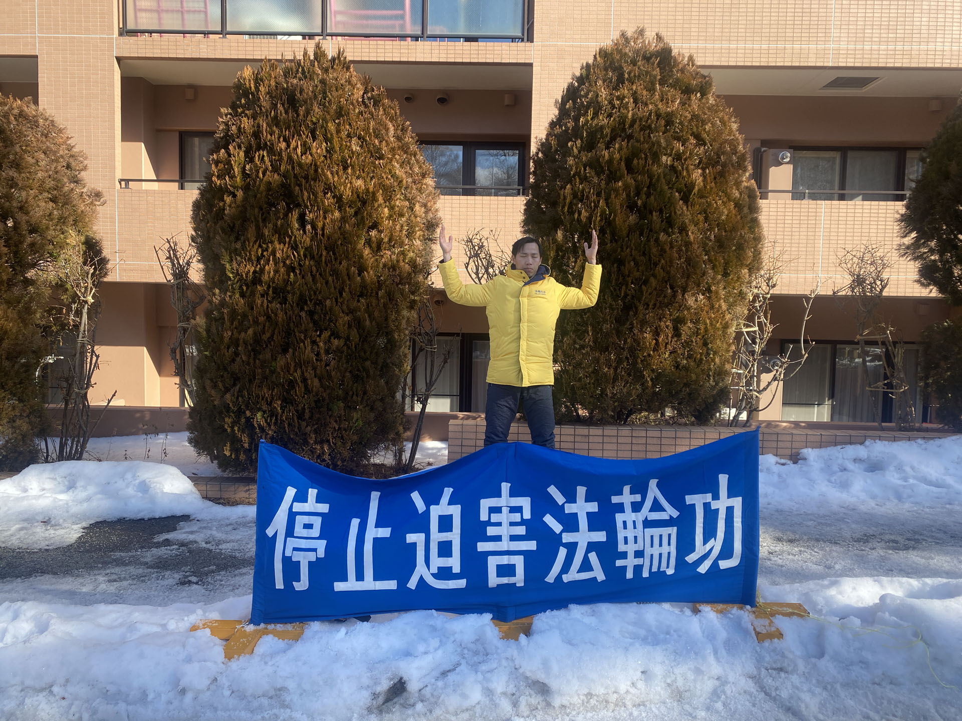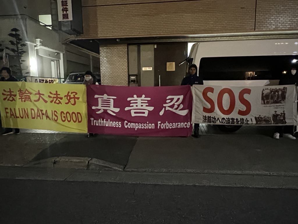 同一天的白天,北海道札幌市的部分法轮功学员也和每年一样,来到札幌中领馆前打出“停止迫害法轮功”的横幅和平抗议。因是冬季户外,法轮功学员的举动吸引了路人的关注。有的行人停下脚步仔细看,有的司机也放慢速度关注了横幅。