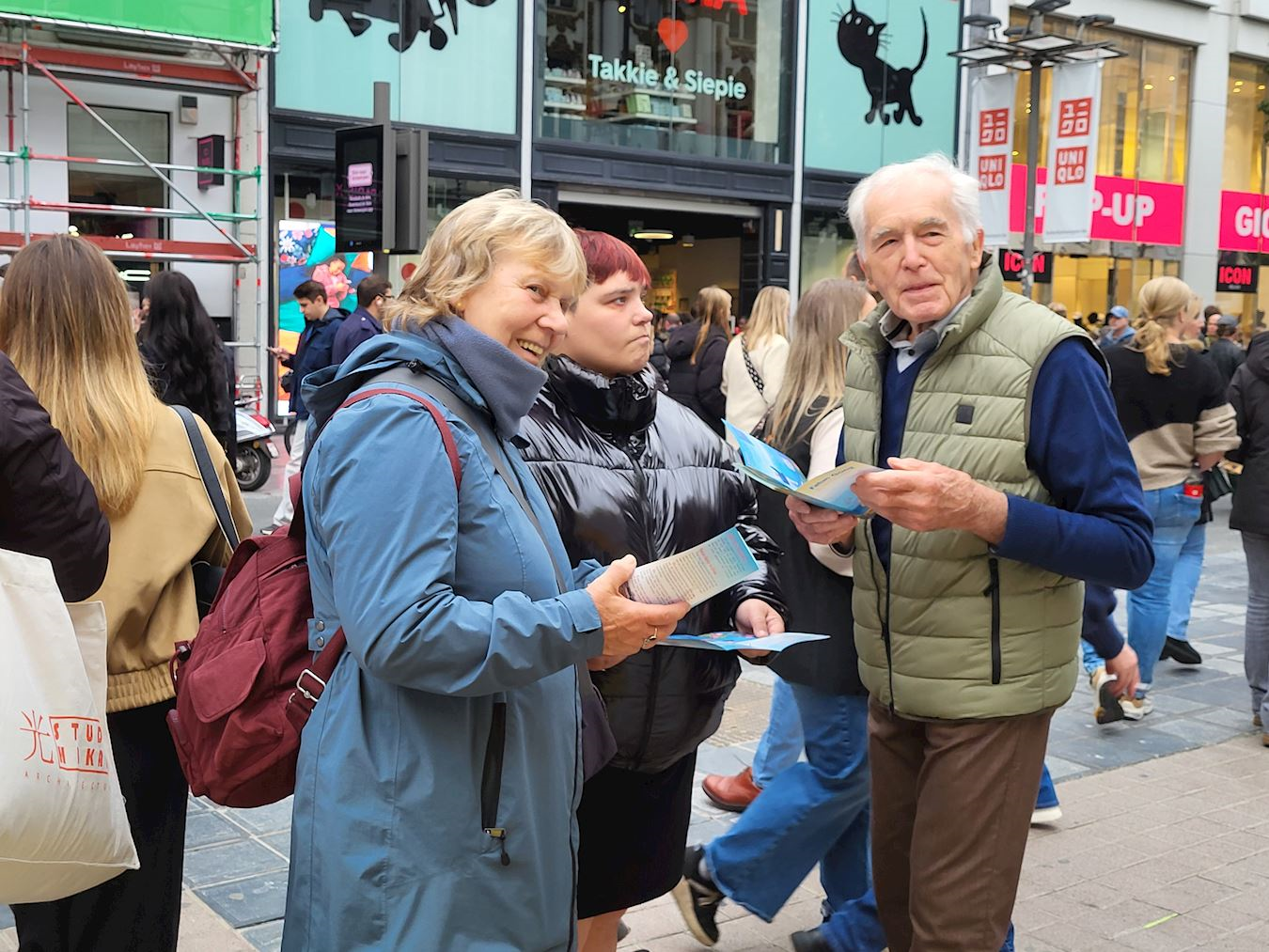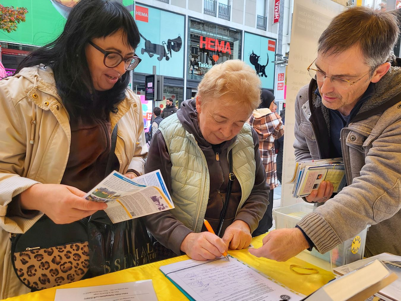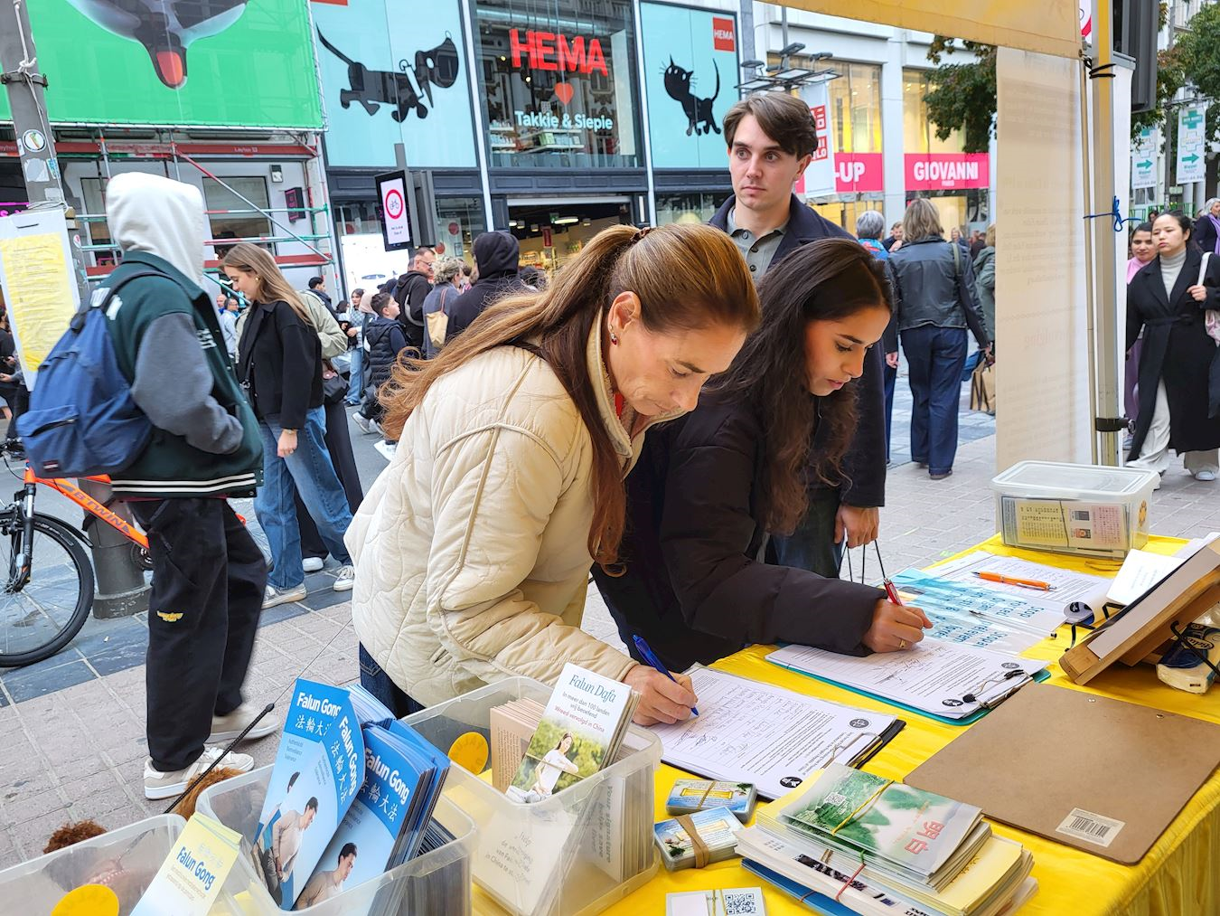 罗吉尔·波尔(Rogier Boor)和伊娃·范德梅尔(Eva Vandermeer)来到活动现场观看炼功后与学员了解法轮功并签名反迫害。