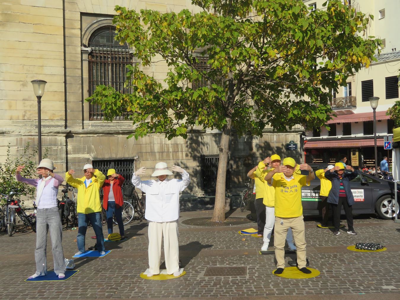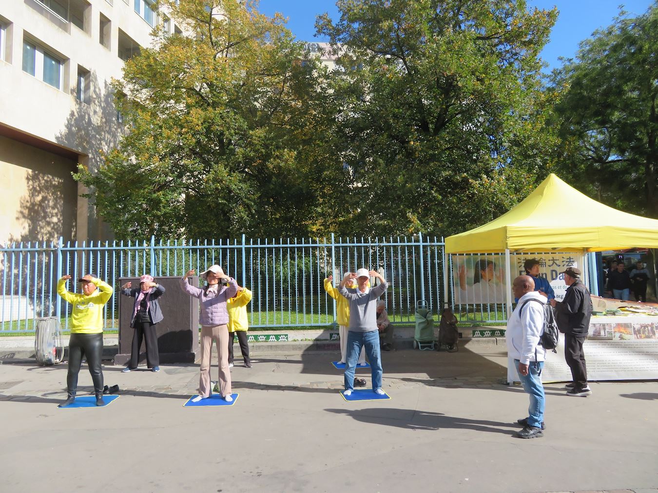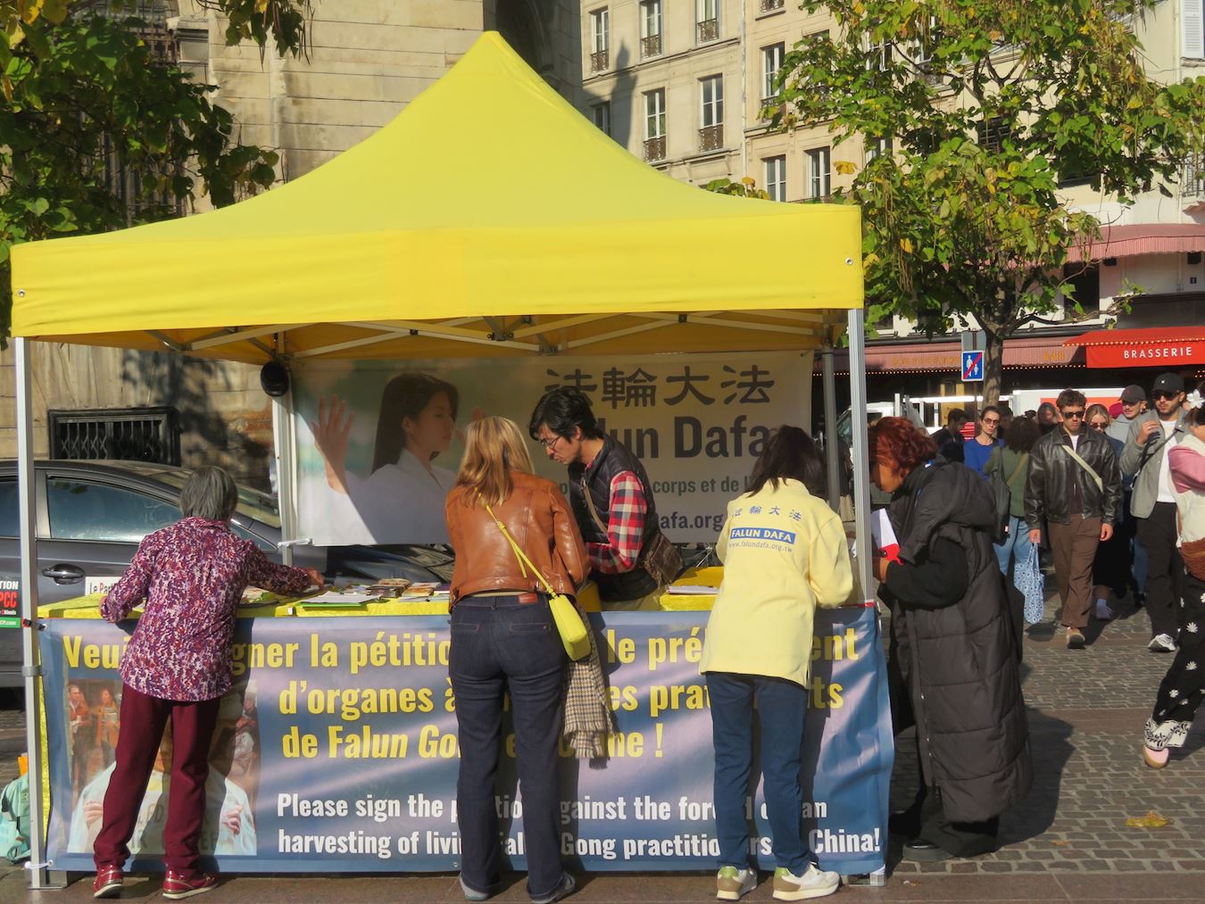 十月十一日在夏特莱街区,在祥和的法轮功炼功音乐声中,法轮功学员的功法演示,吸引了众人观看。很多人都想学炼法轮功,他们记下了巴黎炼功点的地址。醒目的横幅和展板,吸引了人们的注意力。人们了解法轮功真相和中共活摘罪行后,非常震惊和愤慨,在反迫害征签表上签名,希望早日停止迫害。