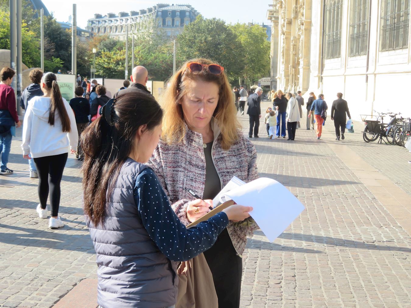 【明慧网二零二五年十月十四日】(明慧记者周文英法国巴黎报道)秋天的巴黎,沐浴在金色的阳光里。二零二五年十月七日和十一日,巴黎部分法轮功学员分别在美丽城和夏特莱街区进行了讲真相和征签活动。