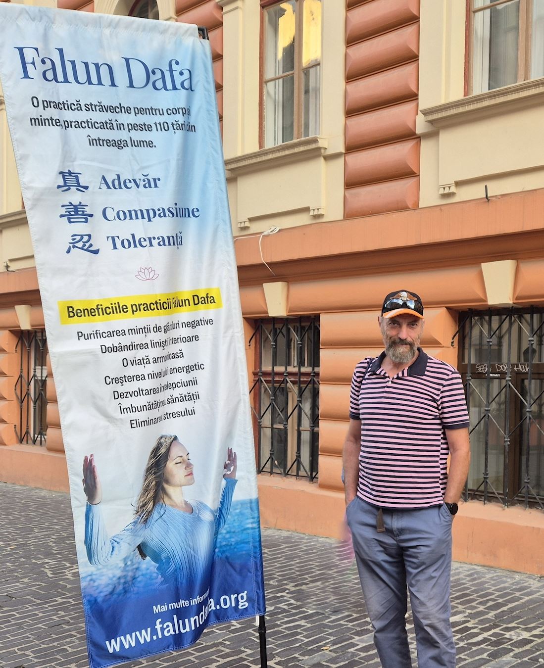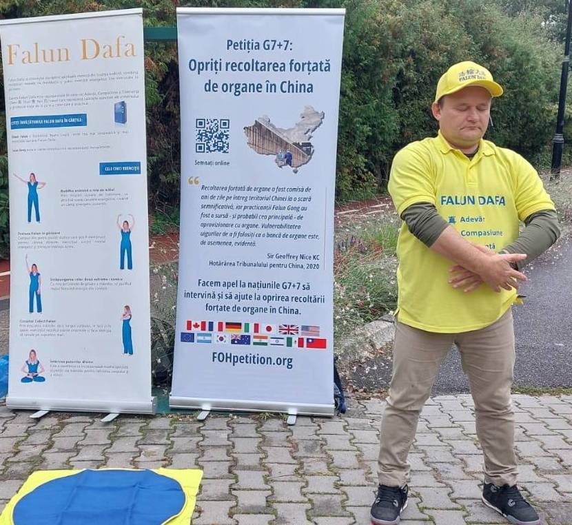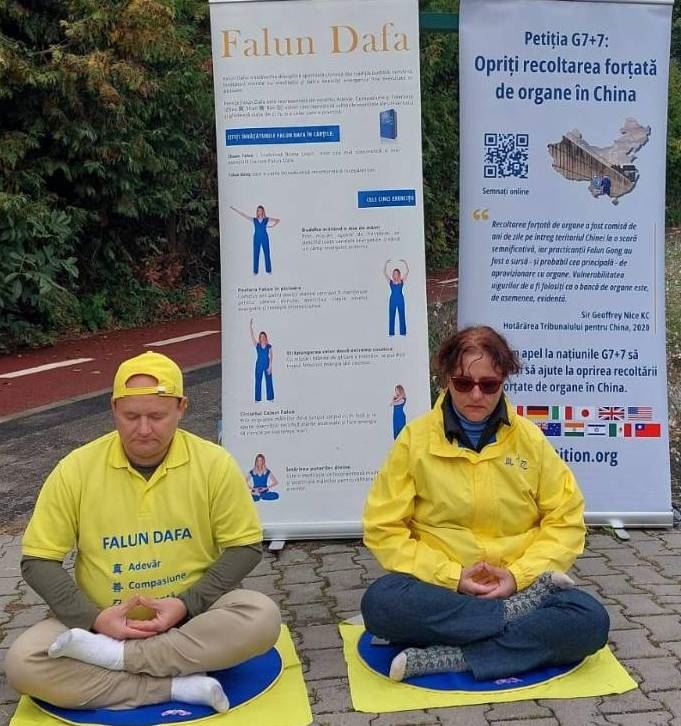 特尔古穆列什(Târgu Mureș)医学院的学生来自全国各地及欧洲,也有许多来自亚洲、阿拉伯国家和非洲的学生。一次,一位外国学生拿了一份包含G7+7请愿书的传单,立刻阅读了内容。传单有罗马尼亚语、英语和匈牙利语版本。她认真看着展板、面带笑容的法轮功学员们,以及正在炼功的学员。然后她走向一位学员,鼓励说:“别担心!一切都会好起来的!”
