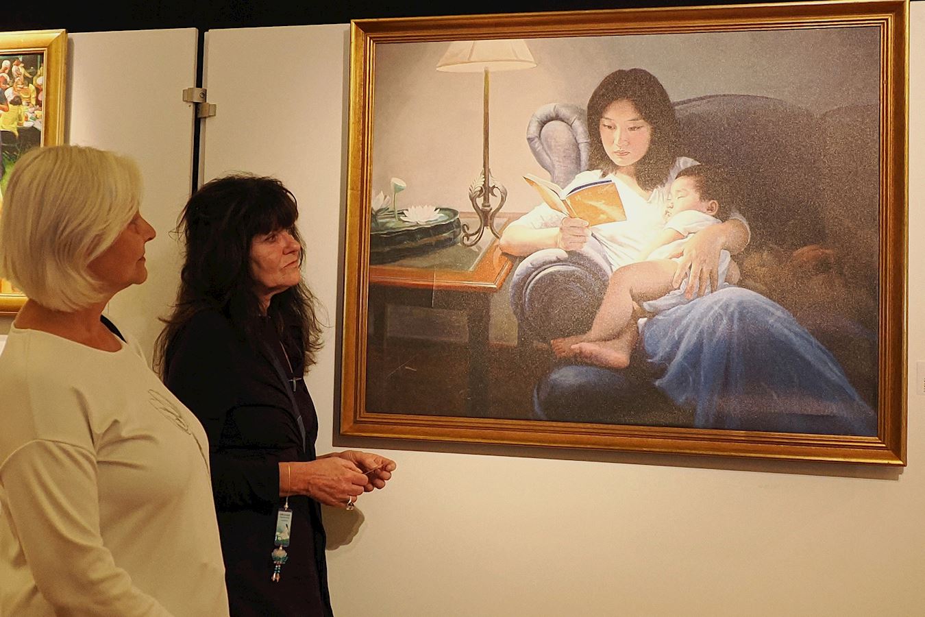 两位女士加布里埃尔和西尔克在开幕当天一直待到展览结束。她们一再回到几幅画前细细端详,并与学员长谈。加布里埃尔当场购买了《转法轮》,西尔克则询问当地的炼功点,表示想要学习功法。