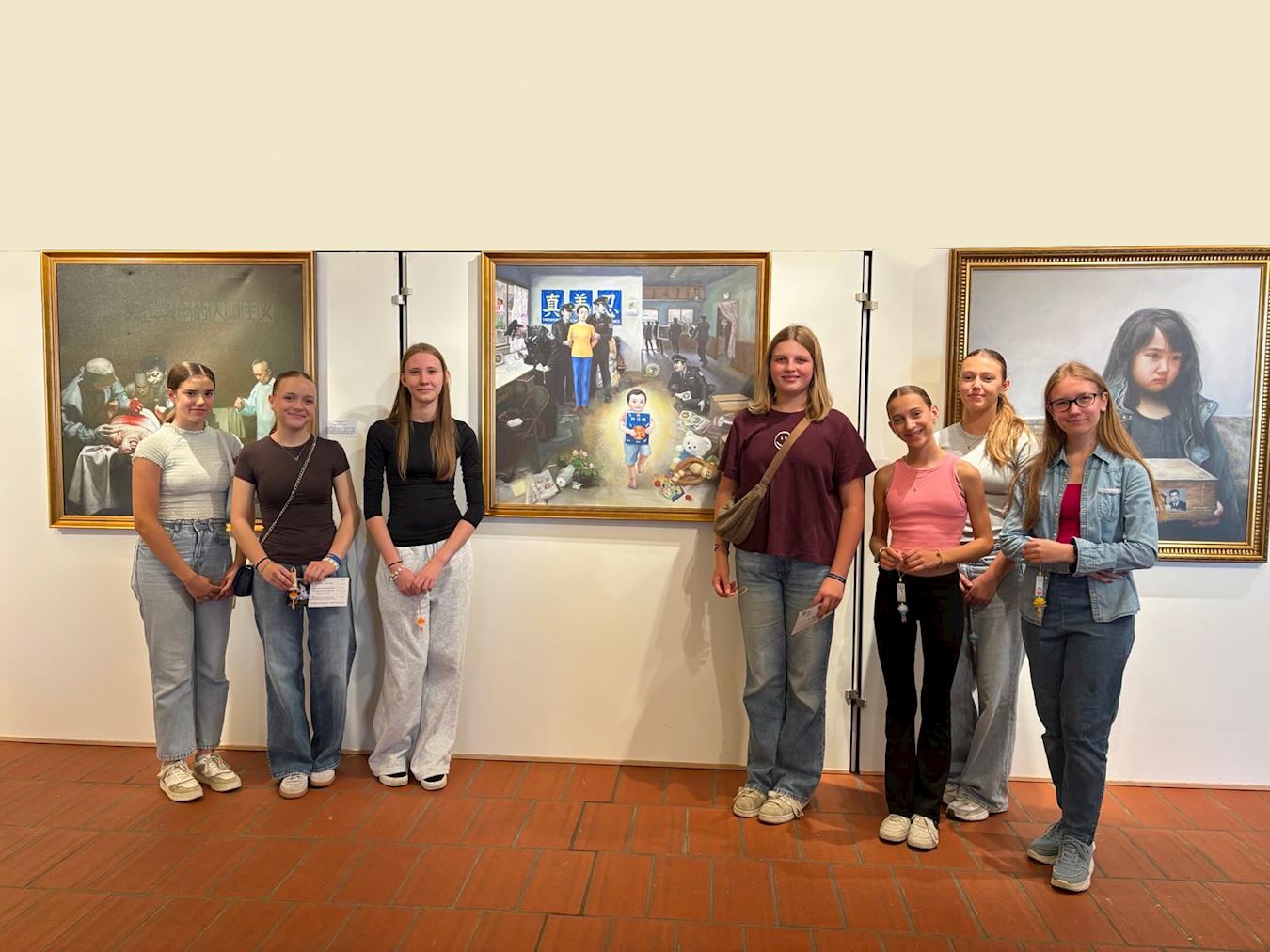 一位十七岁的女学生说,她自己也喜欢画画,是在寻找灵感时偶然走进展厅。她认真地看完每一幅画后说,最触动她的是表现活摘器官罪行的那幅画:“虽然画面悲惨,但从那位受害者身上,我感受到一种力量与光——那种超越痛苦的信念让我很感动。”
