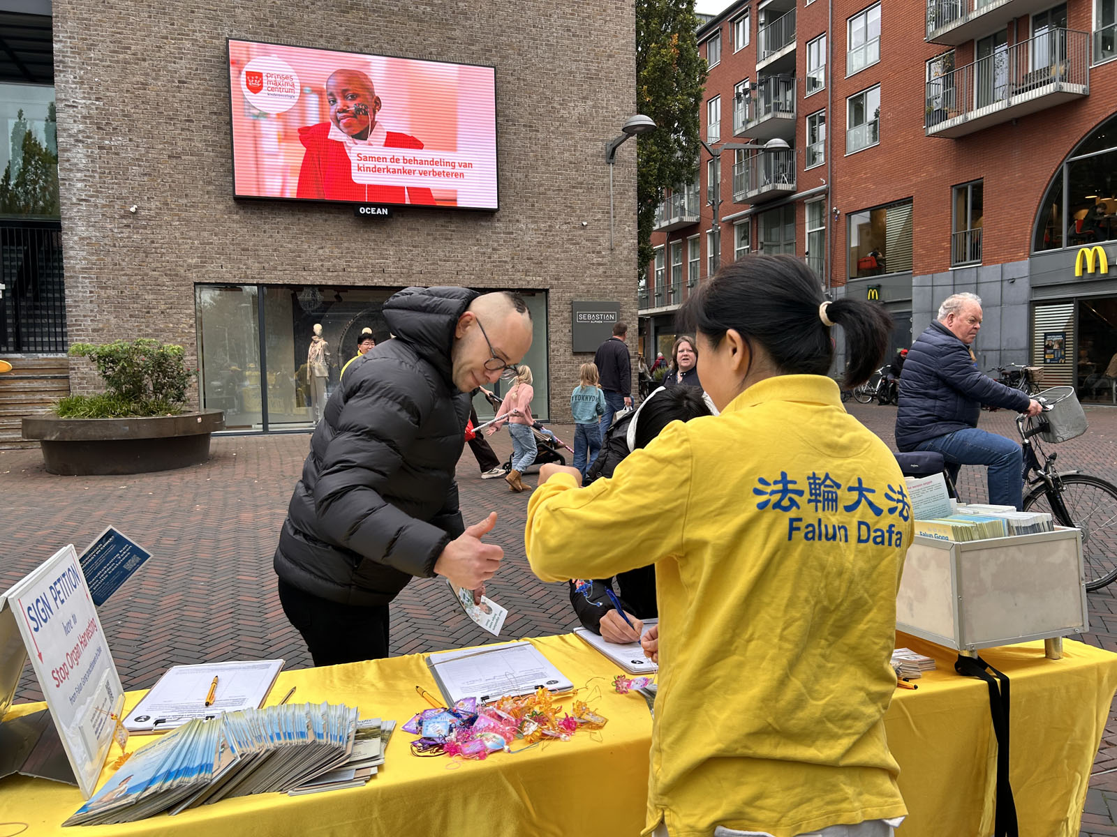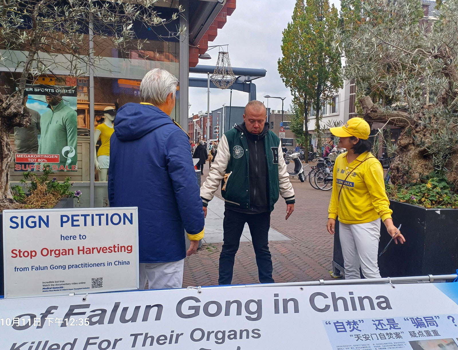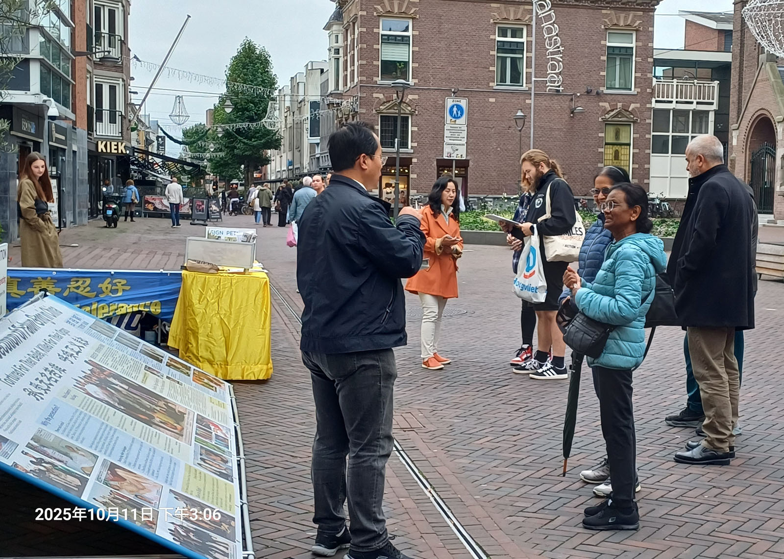 【明慧网二零二五年十月十八日】二零二五年十月十一日,荷兰巡回真相点来到荷兰南部市镇莱茵河畔阿尔芬(Alphen aan den rijn),向当地民众讲述法轮大法的美好,揭露中共对法轮大法的残酷迫害,受到民众的欢迎和支持。