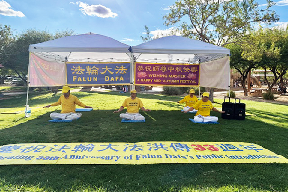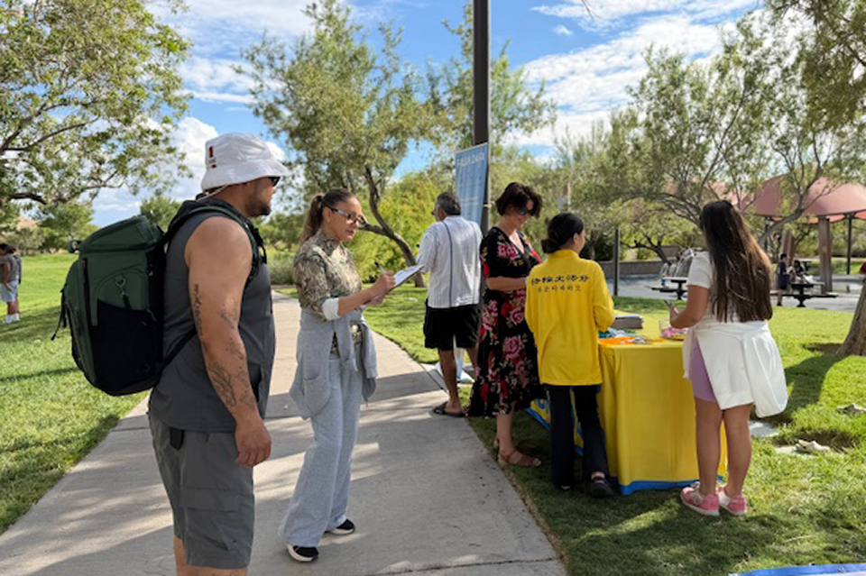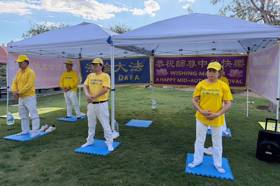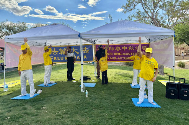 【明慧网二零二五年十月二日】中秋时节“月圆人圆”,寓意着祥和、感念与团圆。一年中秋月又圆,二零二五年九月二十八日下午,拉斯维加斯部分法轮功学员在探索峰公园(Exploration Peak Park)举办庆祝活动,把法轮大法的美好传递给当地民众,同时恭祝师尊中秋快乐,感恩师父的慈悲普度。