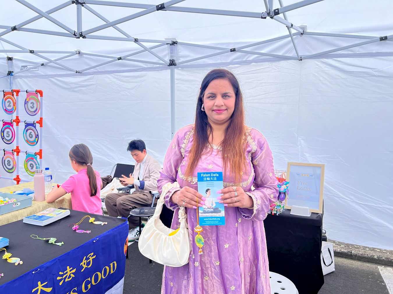 银行职员雪琳·穆罕默德(Shereen Mohammad)来到法轮功展位,她对法轮功学员展现的平和与善意印象深刻。