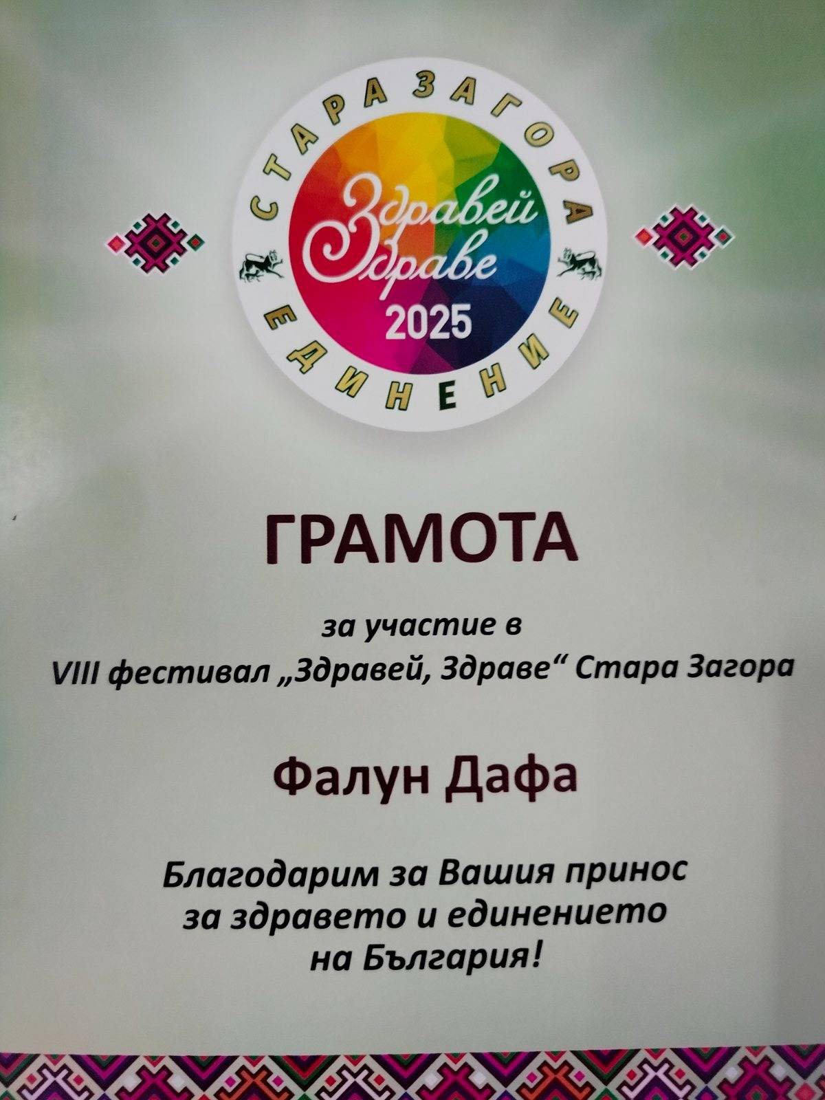 ![]() 图4:证书上写道:感谢法轮大法为保加利亚的健康与团结做出的贡献。 |