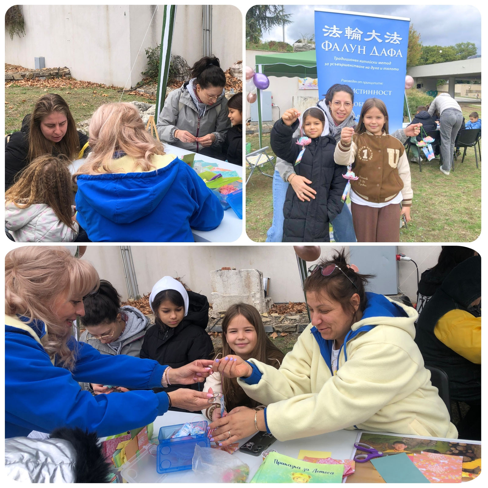 学员们分发介绍法轮大法及其遭受中共迫害的真相传单,与人们交谈,折莲花,并炼功。莲花工作坊除了为孩子们提供有趣的活动外,法轮功学员也告诉孩子们真、善、忍价值观。孩子们在折纸莲花时,学员给他们讲《莲花的故事》,这是一本由法轮功学员编写的儿童读物,旨在教导孩子们在生活中遵循真、善、忍原则。