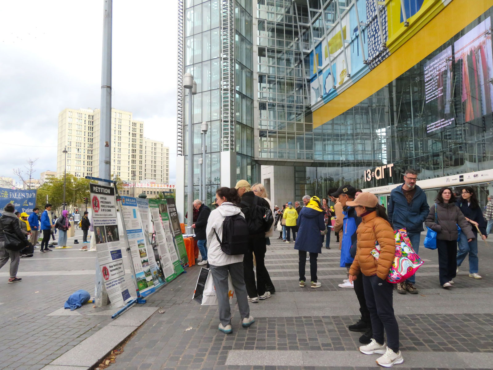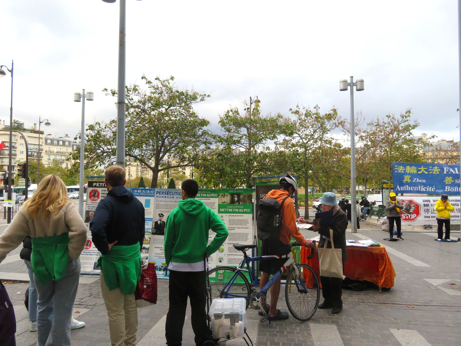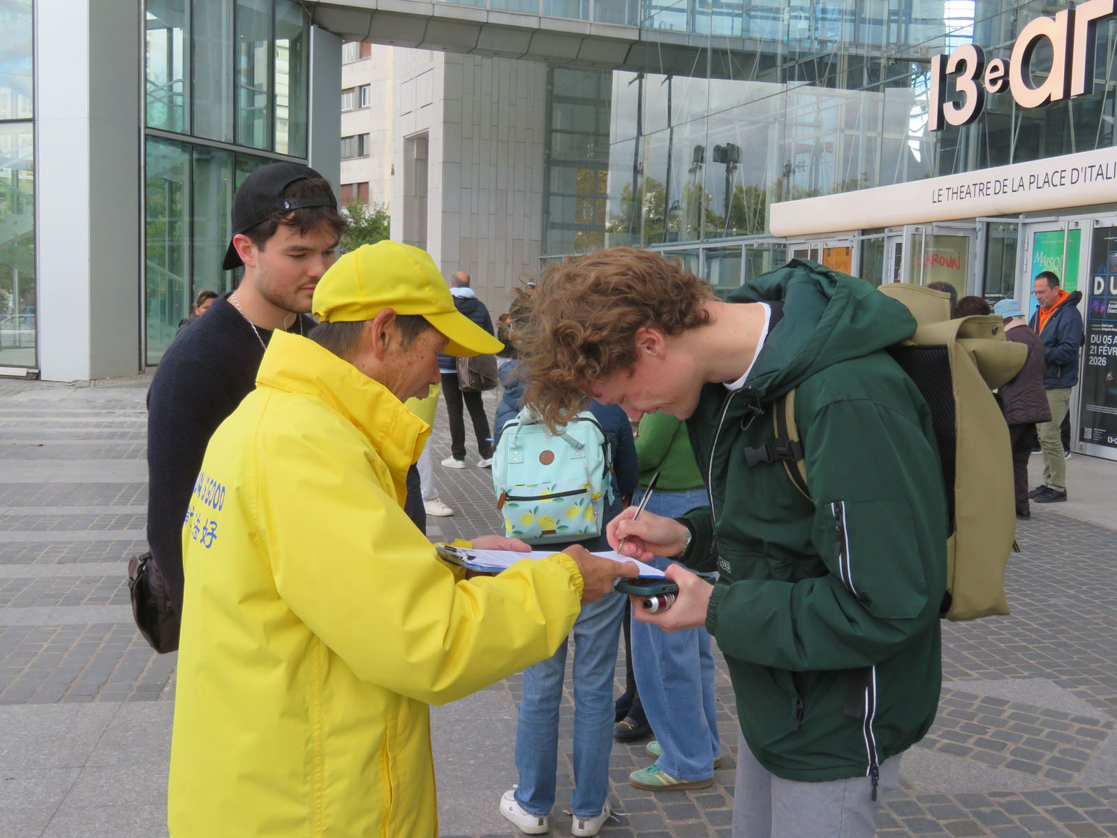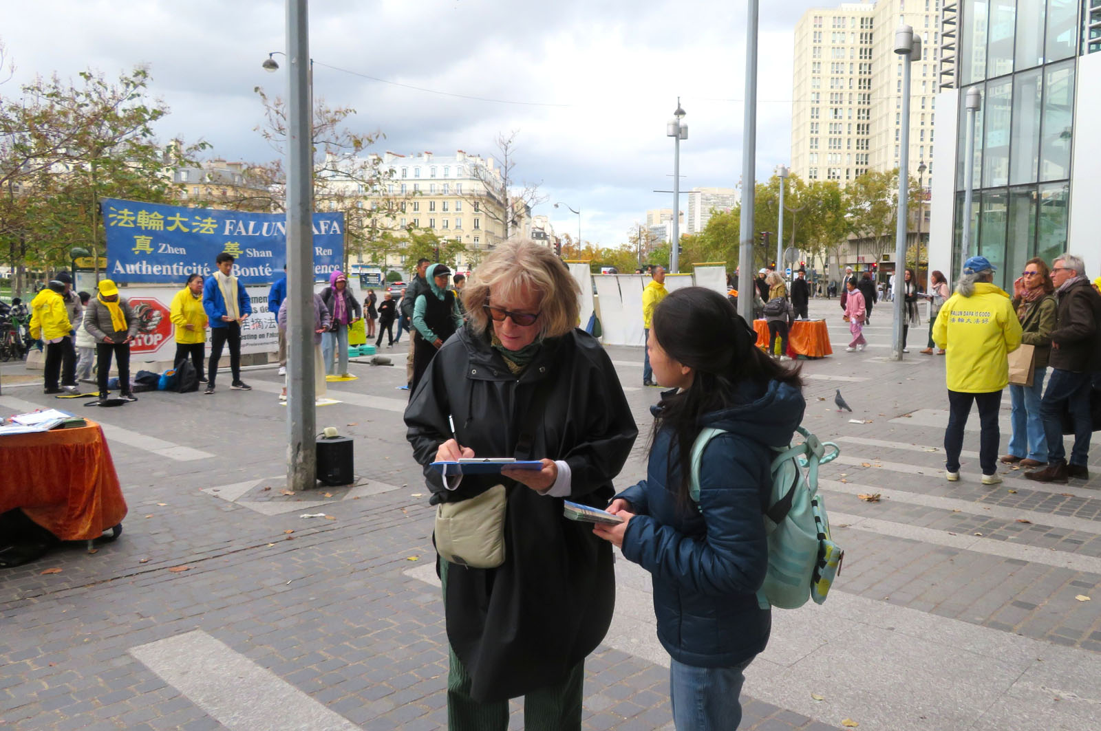 意大利广场位于巴黎十三区,这里有大型的商业中心,广场的另一边是区政府。十月二十五日星期六,法轮功讲真相展位就在面向商业中心的场地上。熙熙攘攘的购物民众,看到了法轮功学员演示着法轮功五套功法,并获悉在中国修炼真、善、忍会受到中共迫害,甚至被活摘器官,他们感受到震惊和愤怒,纷纷在反迫害征签表上签名,并呼吁人们一起来制止中共迫害。