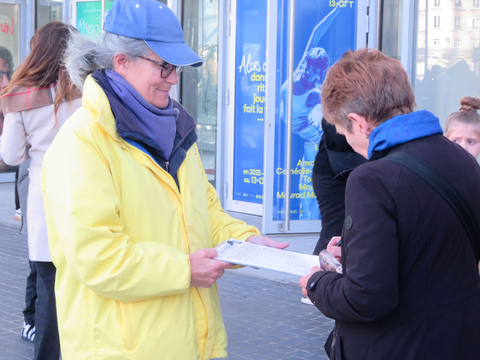 娜塔莉(Nathalie)是社会工作者,这天她偶然经过,第一次听说法轮功和活摘器官,感到非常震惊。她说:“这样随意夺取人的器官实在是太疯狂了。因此,他们其实会死去。”她说这让她感到非常不安,她表示会在她的网页上分享这些相关信息和视频,尽她所能地支持法轮功。临别,她对法轮功学员说:“谢谢你们来到这里,勇于说出真相。祝你们好运!”