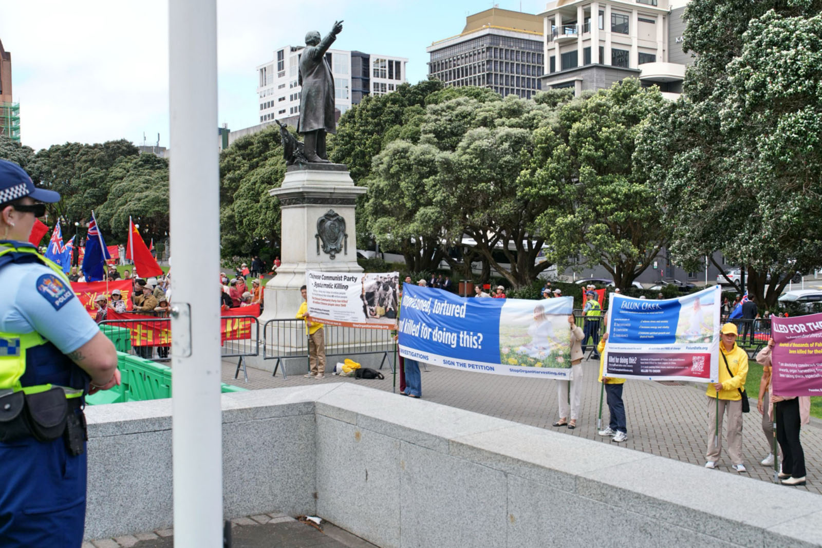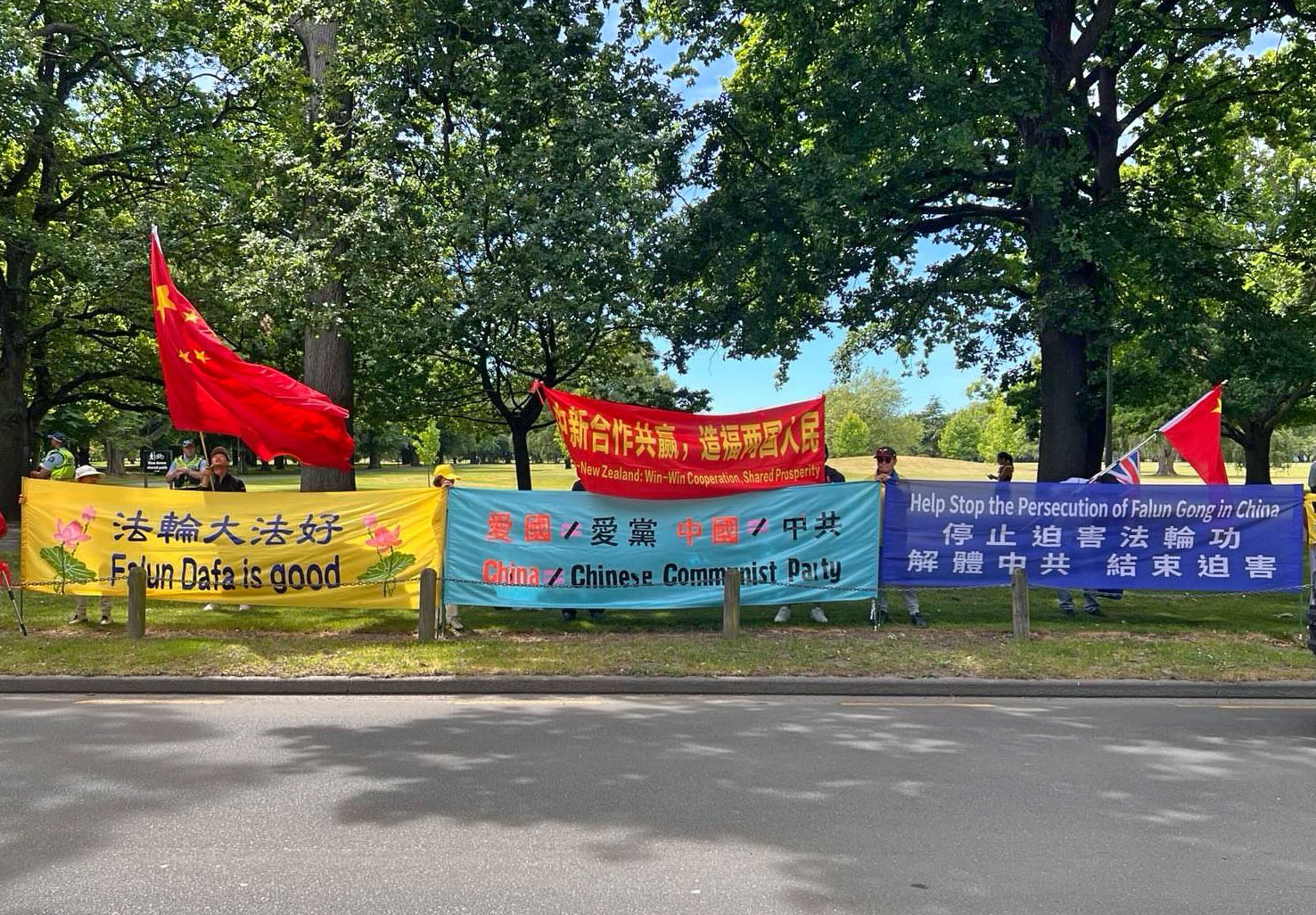 在和平理性抗议的法轮功团体旁边,与之形成鲜明对比的是,一些亲共华人团体成员却进行多次无理干扰。他们试图遮挡横幅、举着贴近的标语阻挡捣乱,并以高声叫喊、敲锣打鼓等方式制造噪音,试图破坏集会秩序。这些行为不仅引起现场路人的侧目,也多次导致惠灵顿国会安保人员和警方到场制止,并协调双方保持距离,确保现场安全。