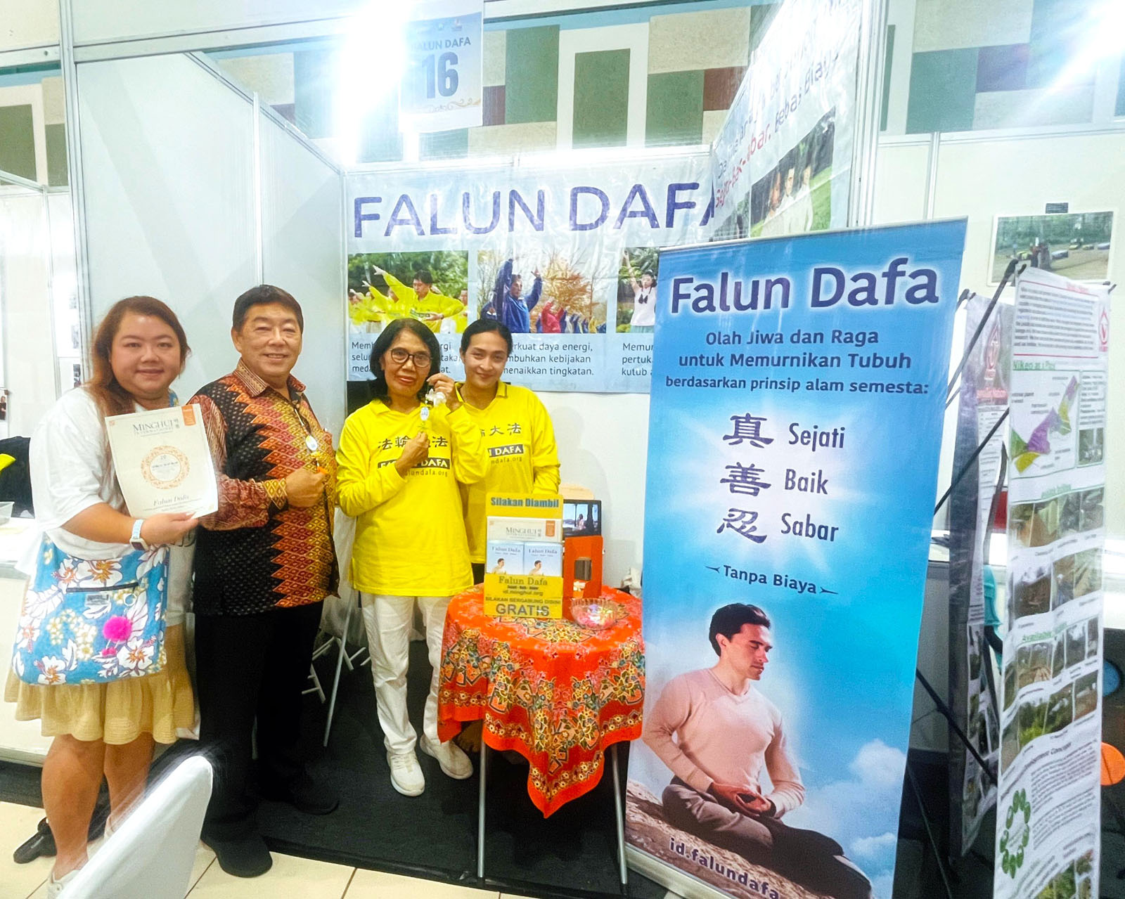 一对印尼华裔夫妇看到法轮大法展位后非常高兴。他们此前到澳大利亚旅行时曾接触过法轮大法,当时妻子还简短地尝试过学炼功法。