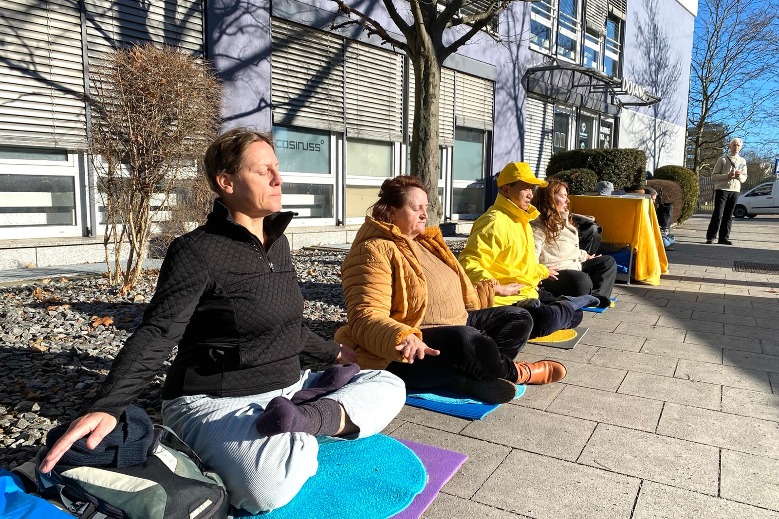二零二五年十二月十日在德国南部最大城市慕尼黑的中领馆前,法轮功学员正在静静地打坐,德国女士阿尼塔(Anita)看到之后,推着自行车走了过来,她说自己之前曾多次看到过法轮功学员在这里举办活动,今天想过来了解一下到底是怎么回事儿。