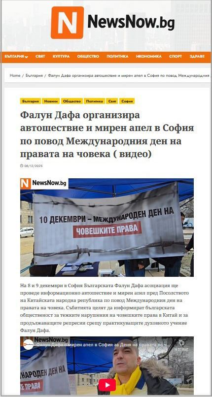【明慧网二零二五年十二月十七日】二零二五年十二月十日国际人权日当天,保加利亚法轮大法学会在索非亚举办活动,谴责在中国持续至今的中共对法轮大法的迫害。保加利亚网络媒体(NewsNow.bg)报道了这次活动。