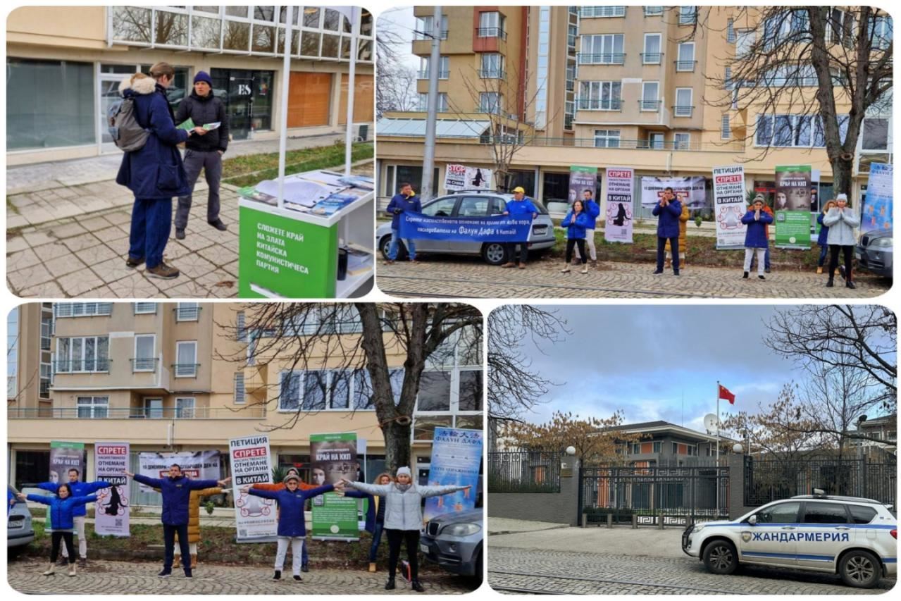 二零二五年十二月九日,学员们于上午十点至中午十二点在索非亚的中共大使馆前举办和平抗议活动。