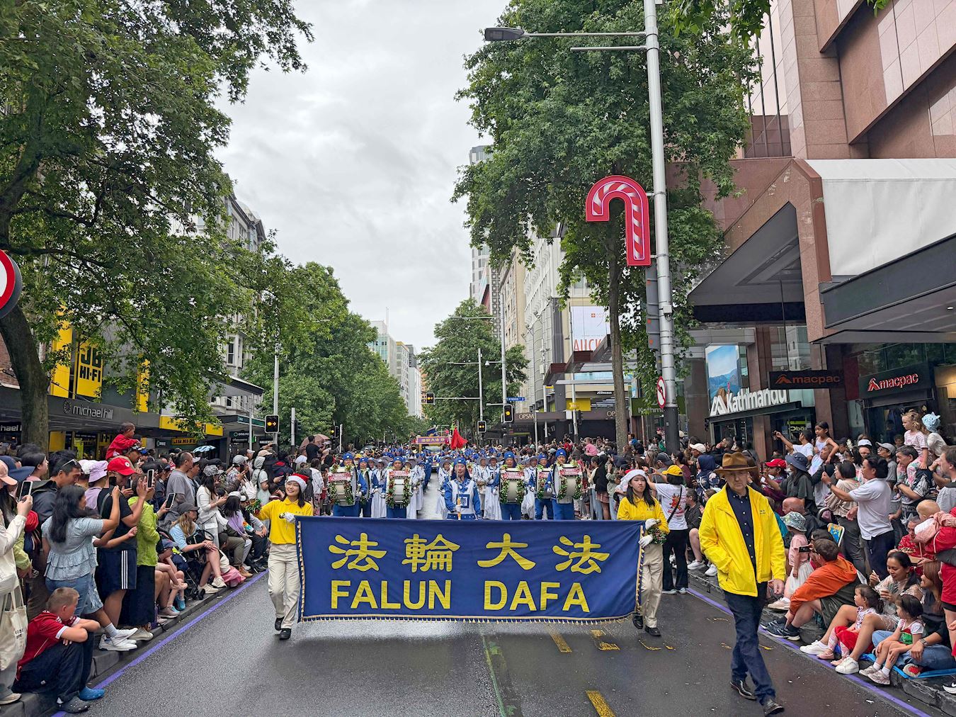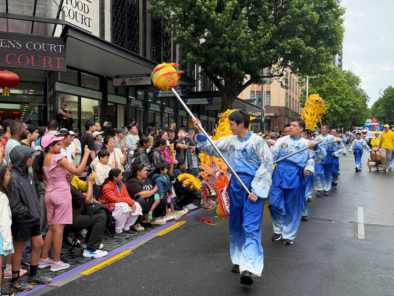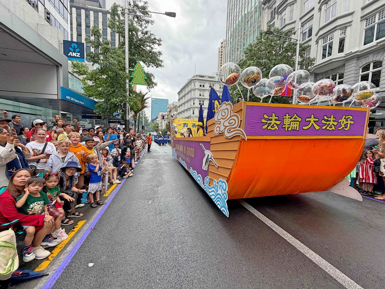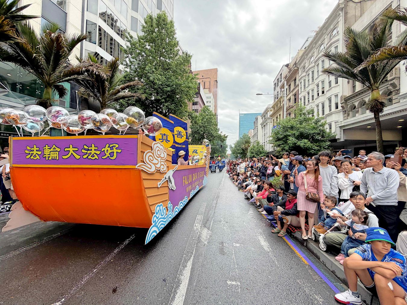 当由澳洲、新西兰法轮功学员组成的天国乐团以整齐的队伍、雄壮的军乐曲风亮相时,全场立刻爆发热烈掌声,不少民众举起手机抓拍精彩瞬间。天国乐团蓝白相间的古典服饰、饱满宏亮的铜管乐声与现场节庆气氛完美融合,令许多观众连连称赞。美丽的法船上中英文真、善、忍理念非常醒目,紧随其后的舞龙队以灵动的龙身、富有动感的节奏,引发孩子们阵阵惊呼,街道两旁的人群不断挥手致意。