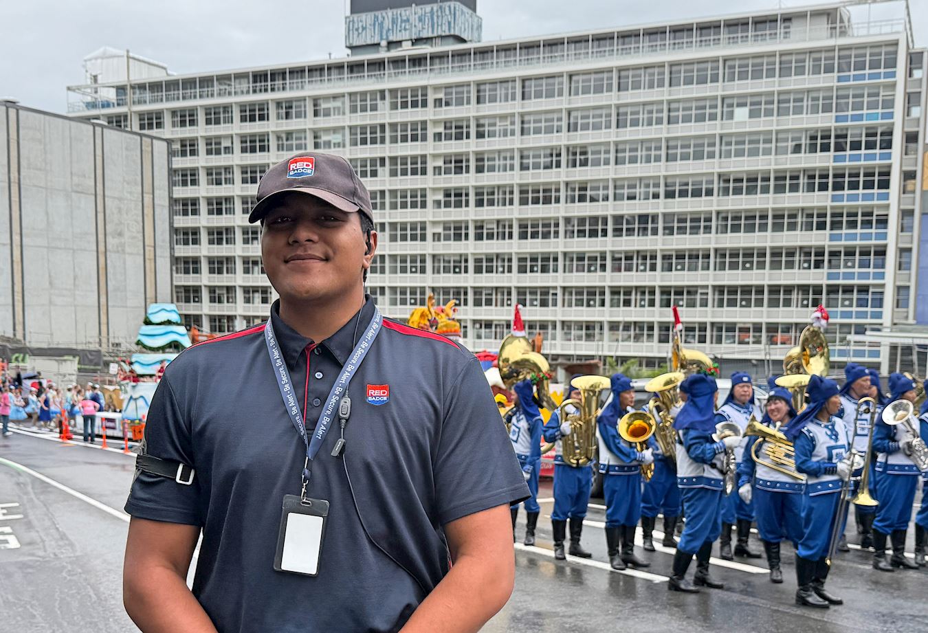 今年二十二岁的卡姆琳(Kamryn)在奥克兰 Farmers 圣诞大游行中担任保安,他兴奋地表示:“我曾祖母是汉族人,所以看到中国人在游行中的亮相,我觉得非常开心。他们(法轮功团队)的服饰真的很美。”