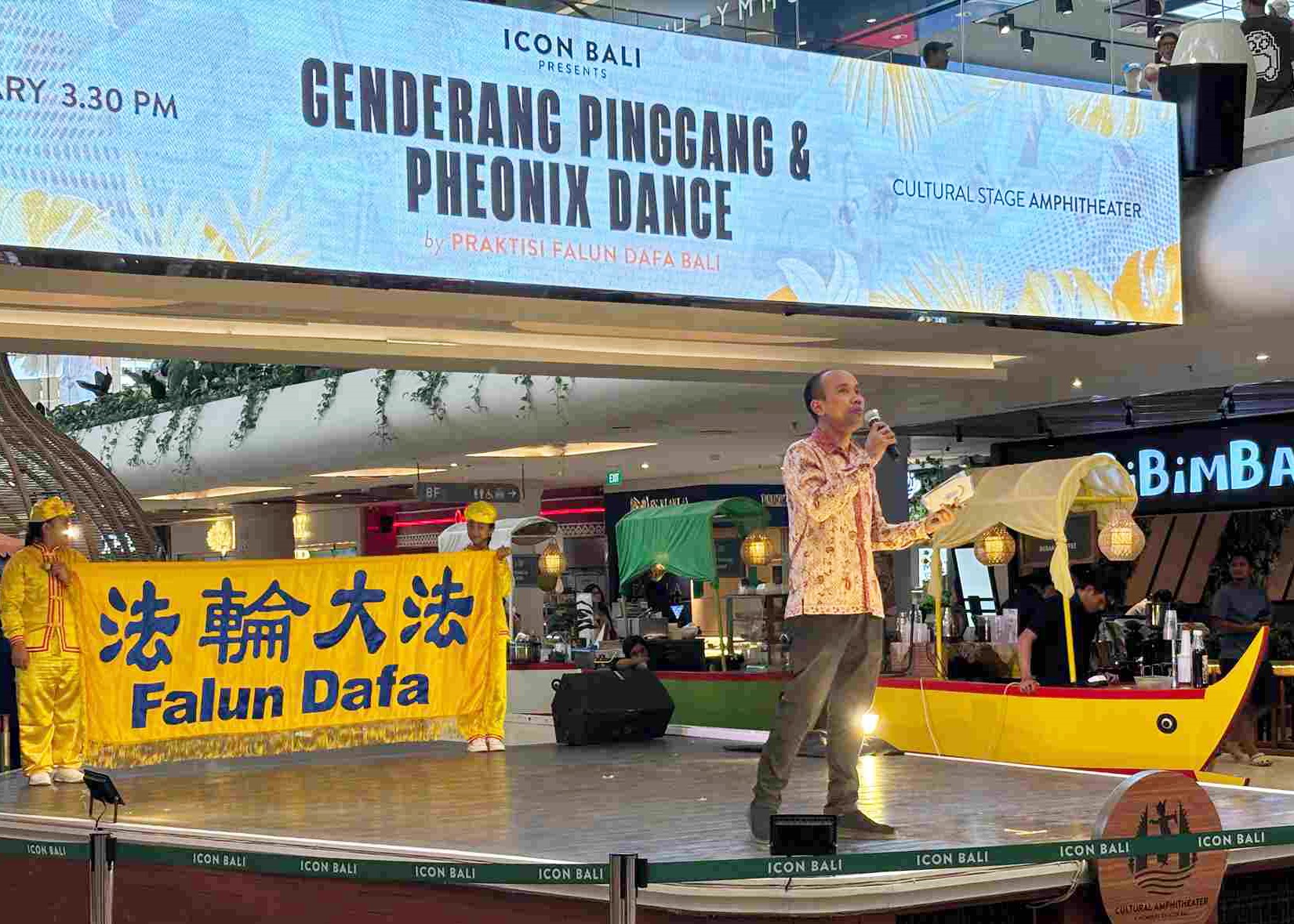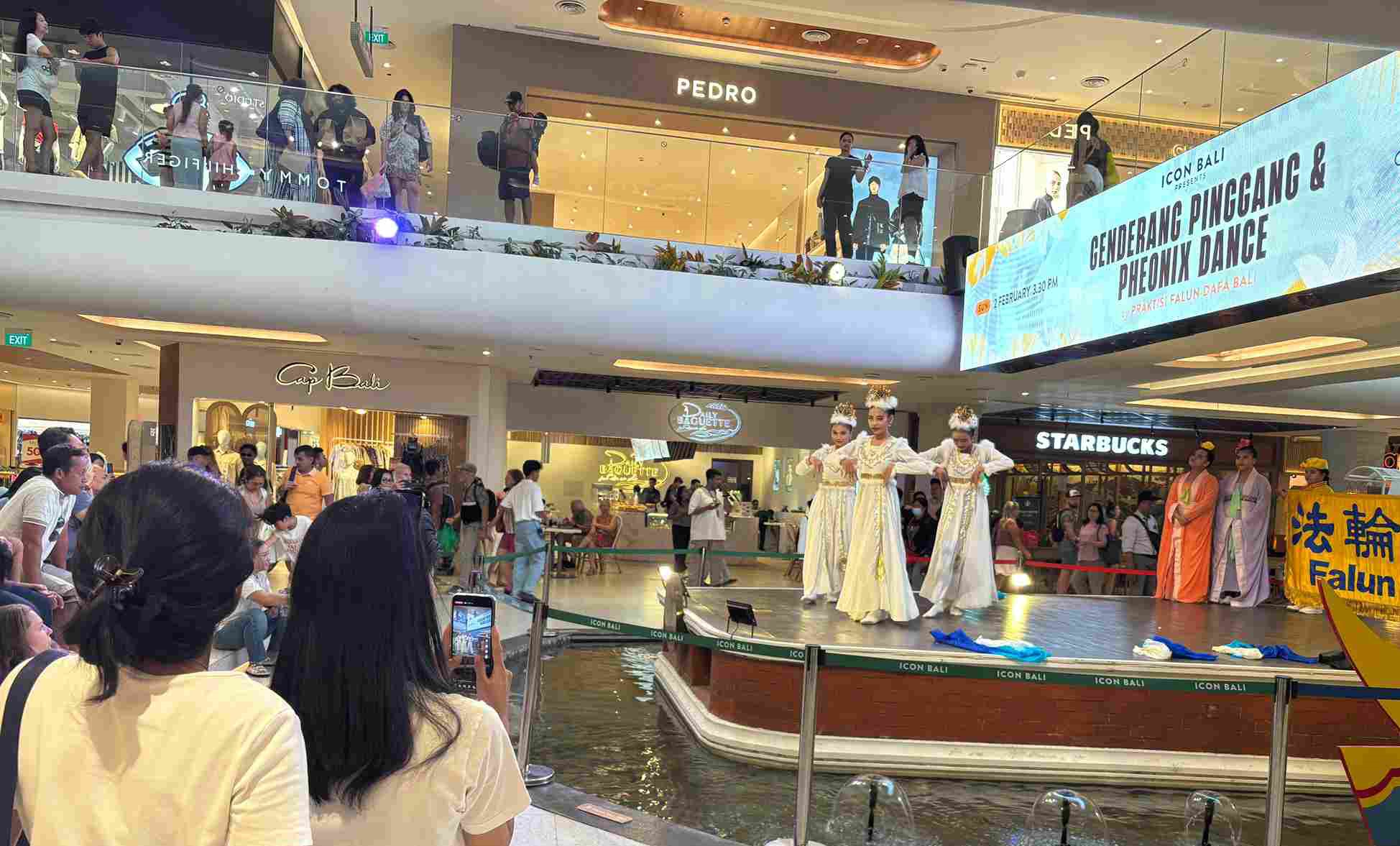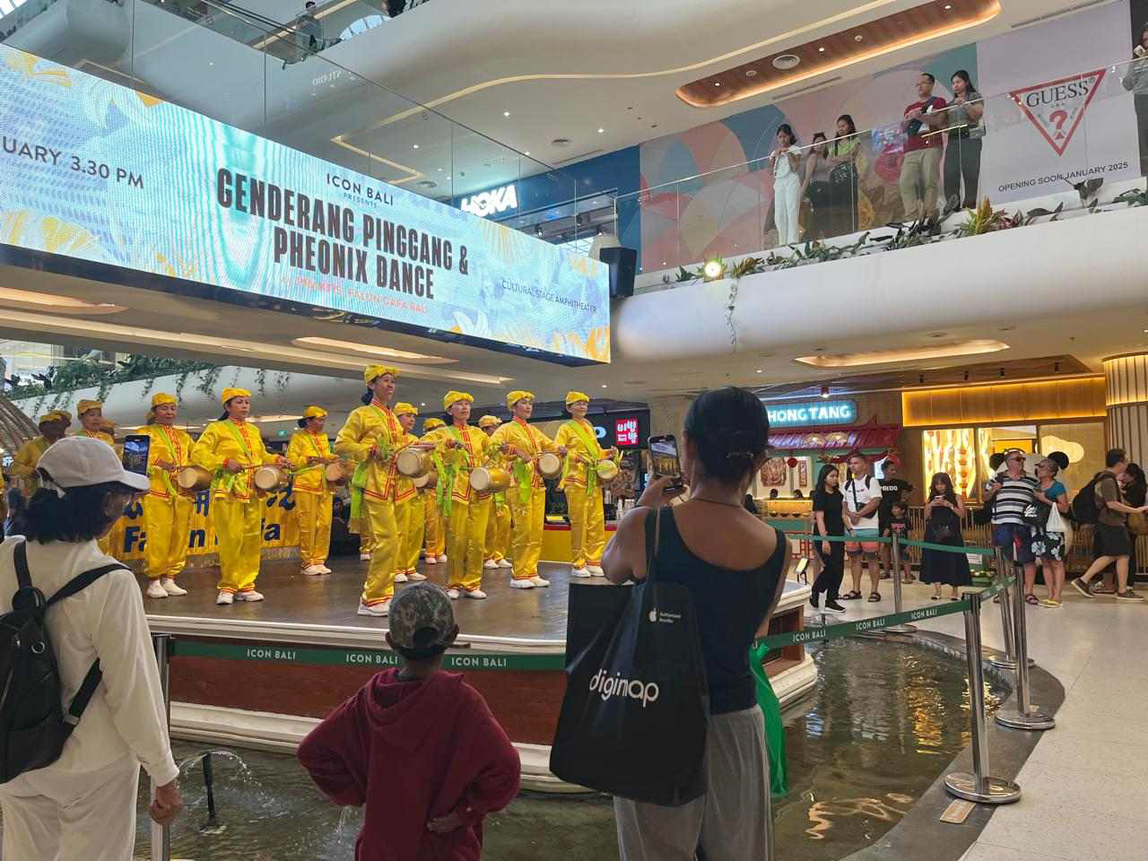 图1~4:法轮功学员在巴厘岛的大型购物中心(Icon Mall)的舞台上表演腰鼓和凤凰舞,一个小时的表演吸引了众多的游客。 |