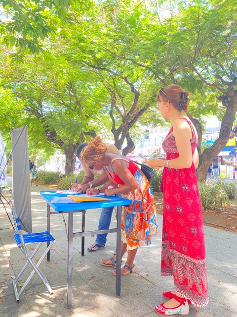 目前,我们在这里讲真相征签近两个月了。人们开始自发地停下来阅读展板,在这种情况下,与他们交谈和征签变得相对容易。还有一些人想学炼法轮功,我们就教他们炼功动作。