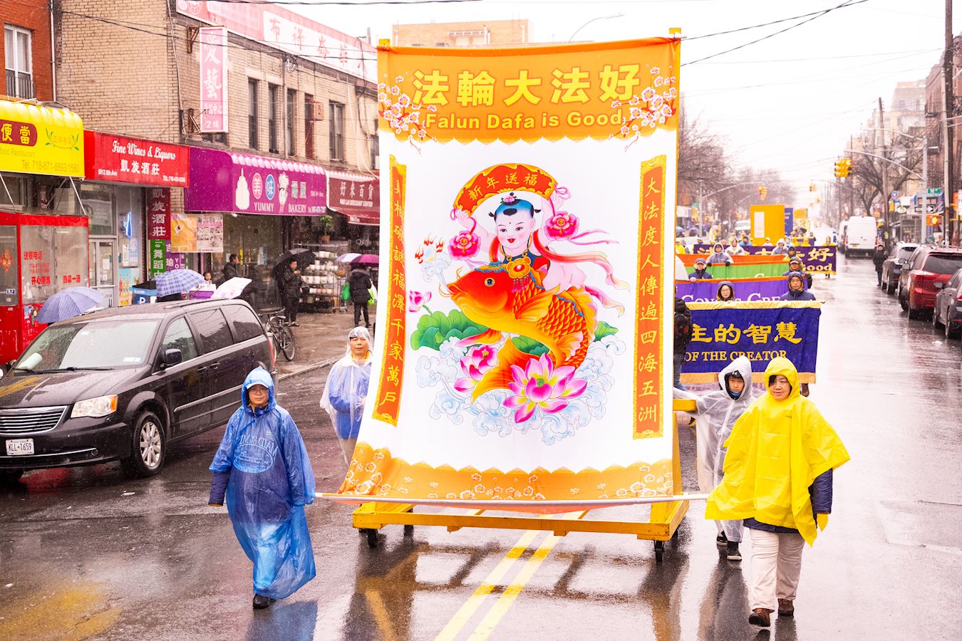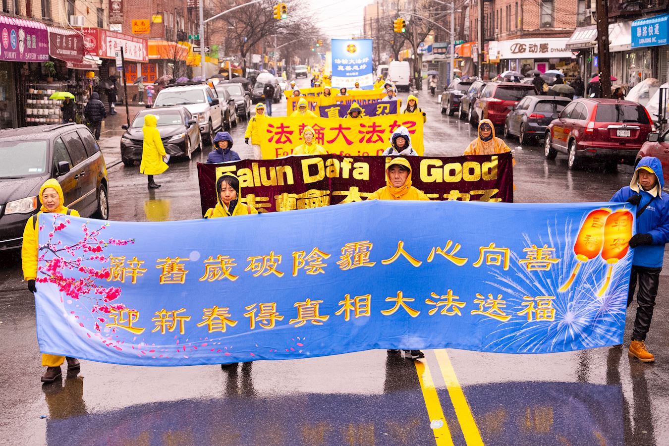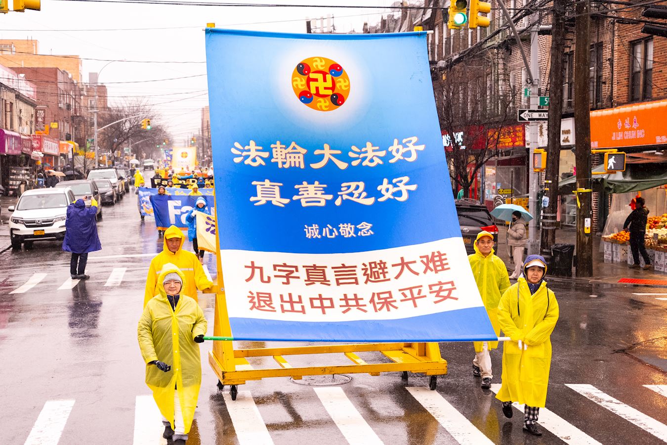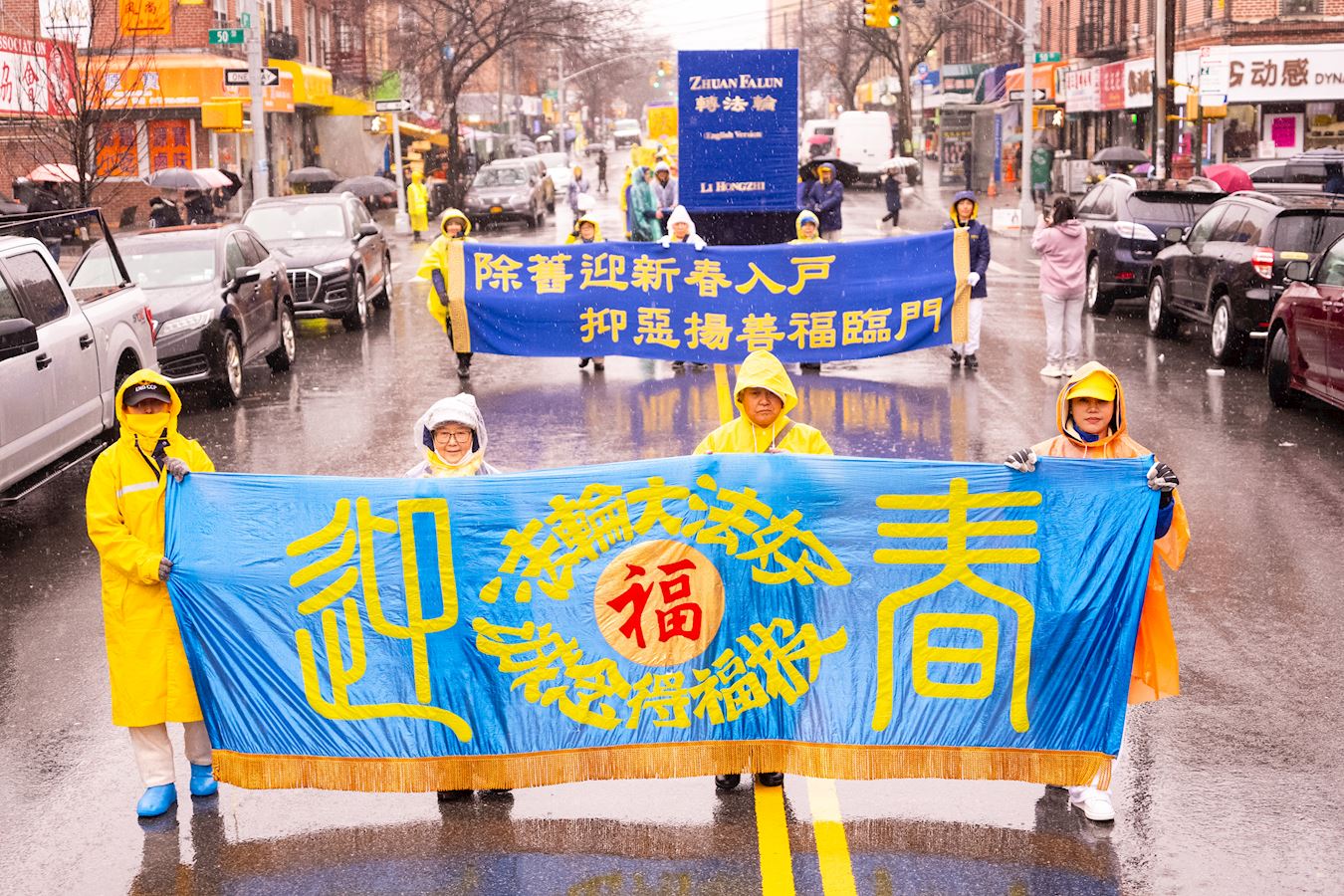 风雨中,游行队伍从八大道的41街走到59街,不少民众对法轮功学员感到钦佩。观众表示:“反正就是好,一定要做好人!” “看他们的着装、昂首阔步,方方面面都很棒!我很喜欢!” “感觉挺有新年的喜庆。” “我都喜欢,所有队伍都很棒!”