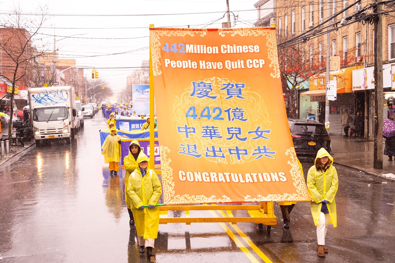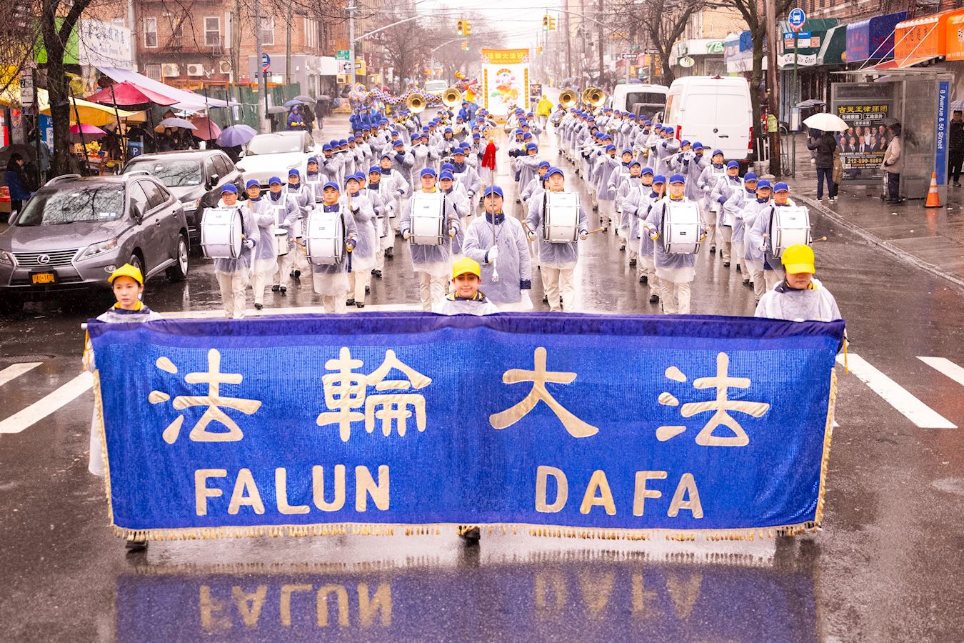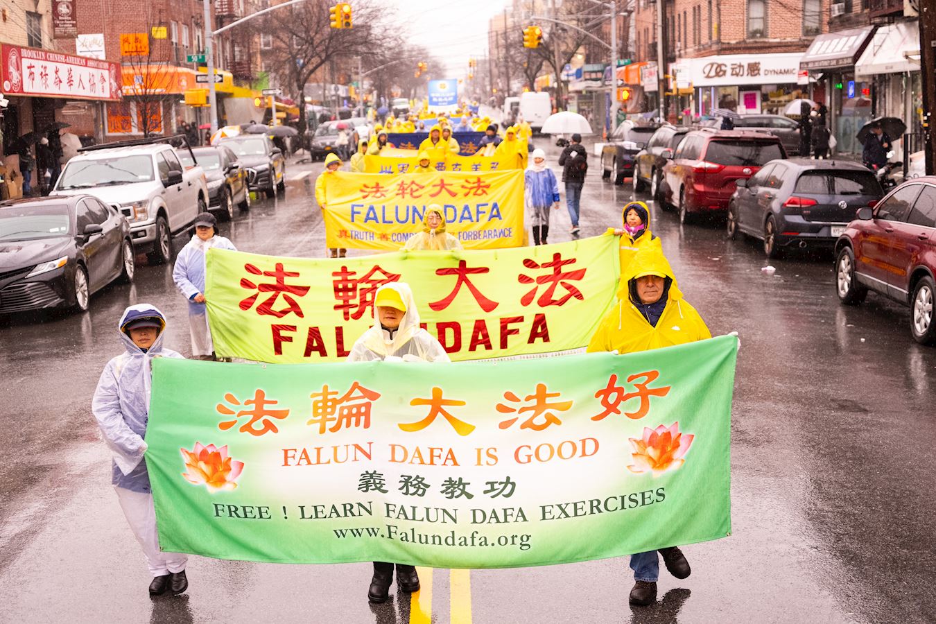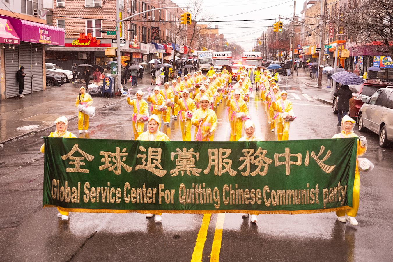 风雨中,游行队伍从八大道的41街走到59街,不少民众对法轮功学员感到钦佩。观众表示:“反正就是好,一定要做好人!” “看他们的着装、昂首阔步,方方面面都很棒!我很喜欢!” “感觉挺有新年的喜庆。” “我都喜欢,所有队伍都很棒!”
