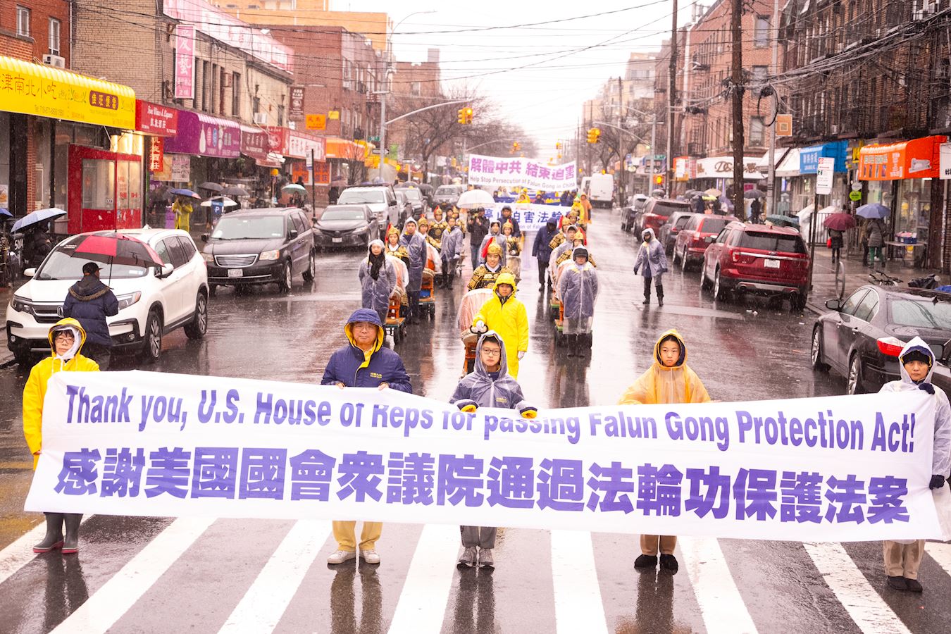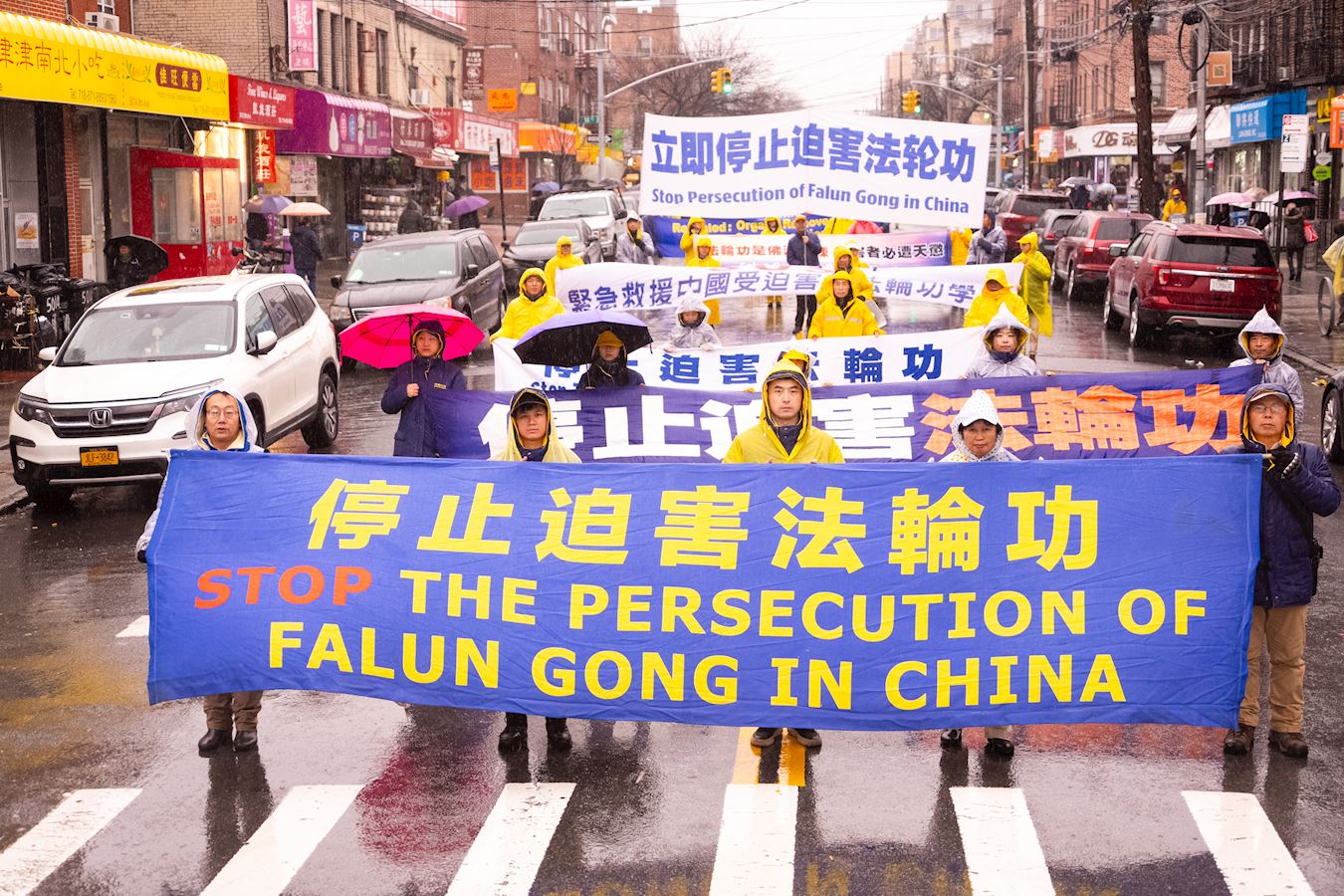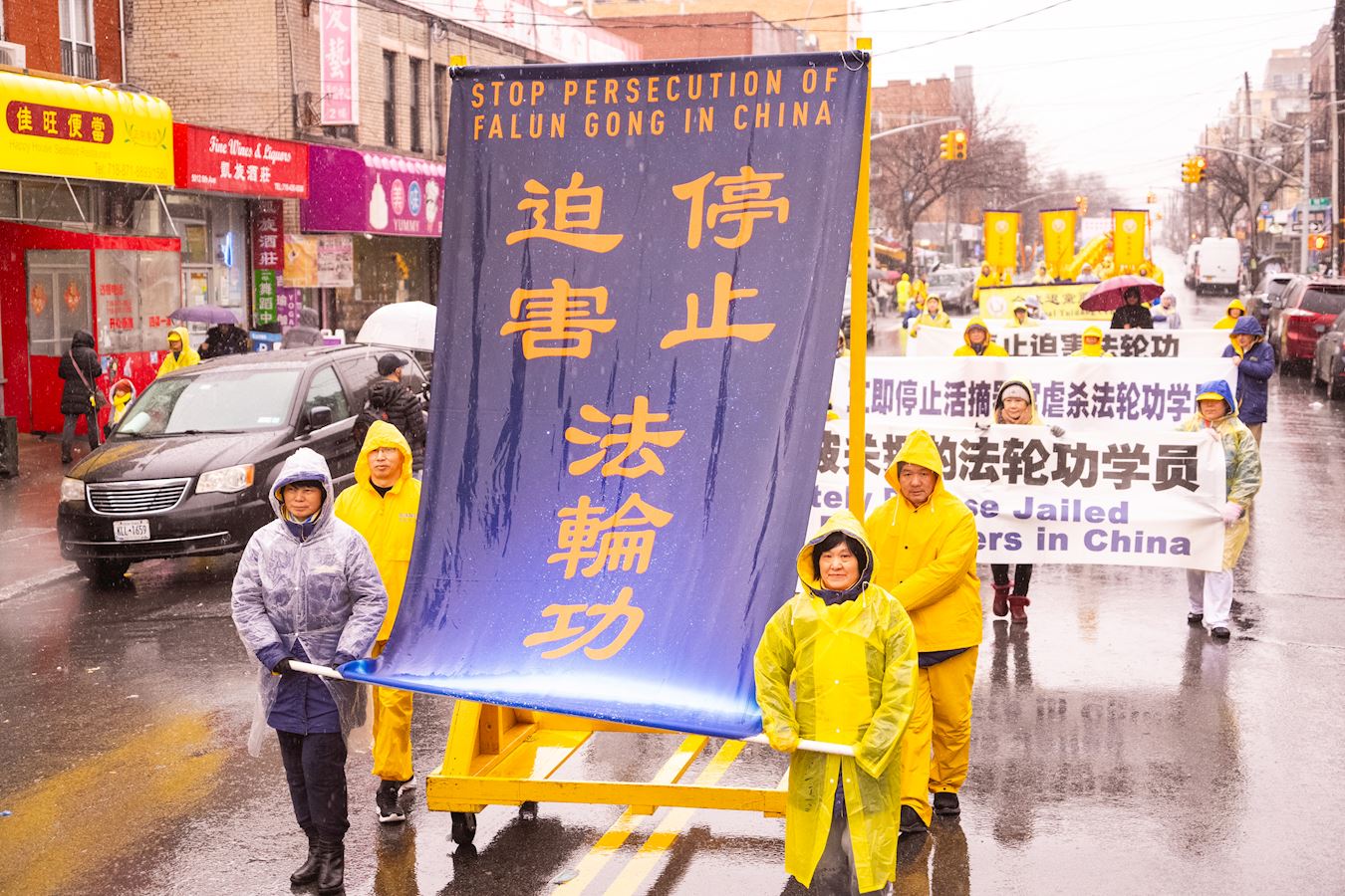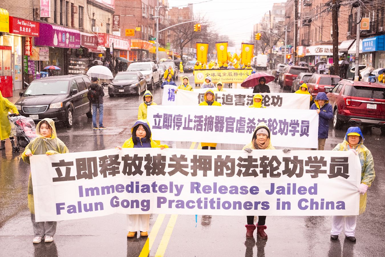 身穿厨师服、在门口观看的邝先生则表示,他来美国才两年,以前在广东农村,只听说过共产党打压法轮功,然而在美国,法轮功不仅能公开游行,还有警车开道护航。“在中国,这是完全不可能的。”他表示,“这么大的雨,他们还坚持,队伍还这么整齐,气势很强,很有纪律。”