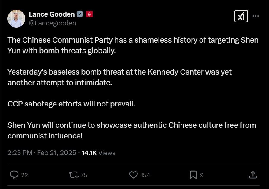 美国德州国会众议员兰斯·古登(Lance Gooden)二月二十一日发文说:“中共一直无耻地向全球神韵(演出剧场)发出炸弹威胁。昨天在肯尼迪中心发出的毫无根据的炸弹威胁是又一次恐吓企图。中共的破坏活动不会得逞。神韵将继续展示不受共产主义影响的正宗中国文化!”
