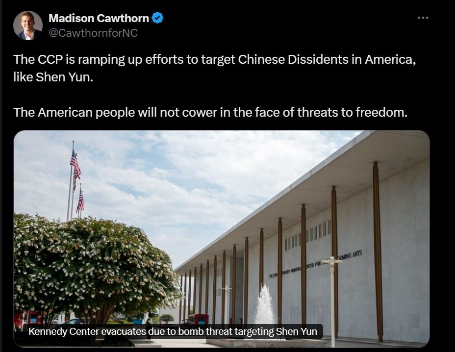 【明慧网二零二五年二月二十三日】(明慧记者王英编译报道)二零二五年二月二十日,神韵艺术团在美国华盛顿D.C.肯尼迪艺术中心歌剧院(The Kennedy Center Opera House)的首场演出遭遇炸弹威胁,剧场被迫进行疏散。美国德州国会众议员兰斯·古登(Lance Gooden)和北卡罗莱纳州前国会众议员麦迪逊·考索恩(Madison Cawthorn)发文谴责中共的威胁恐吓,并强调中共的破坏活动不会得逞。