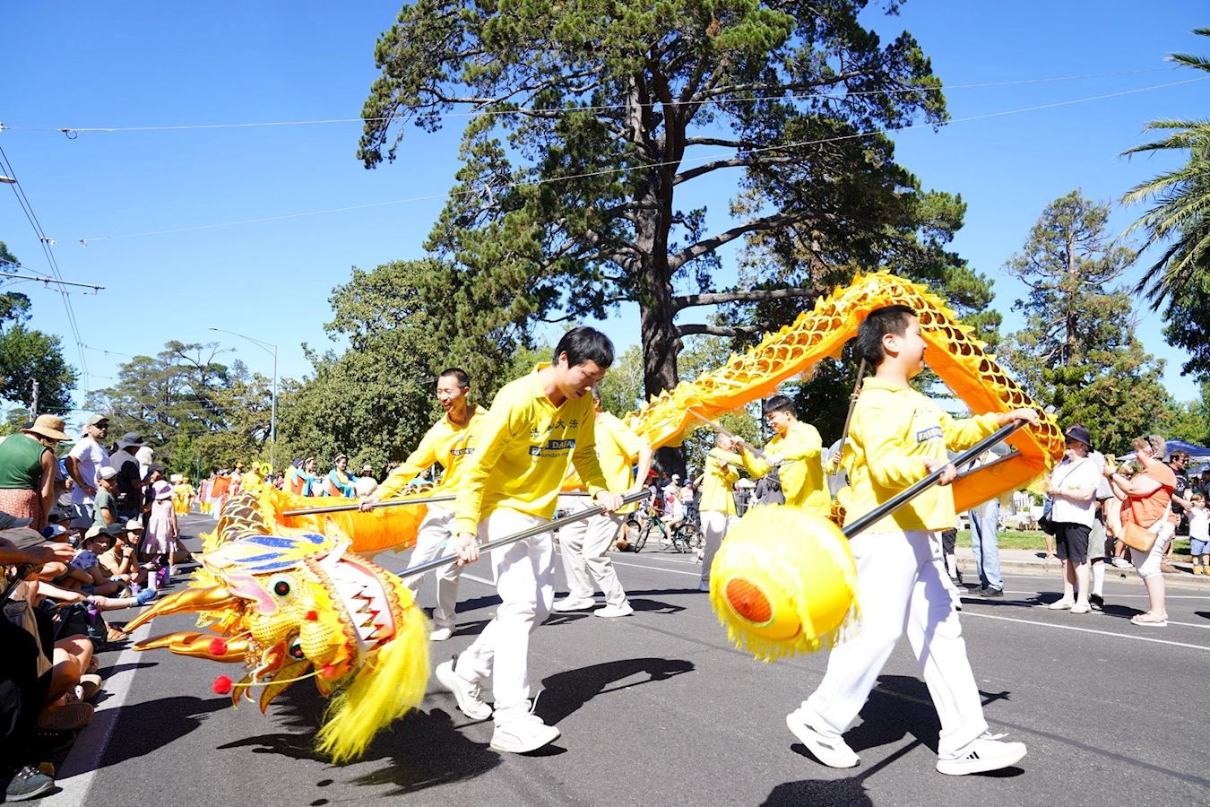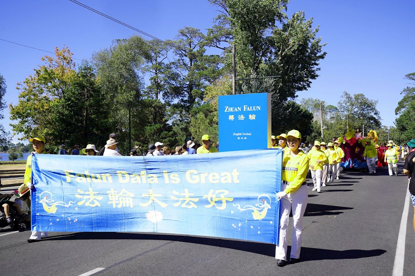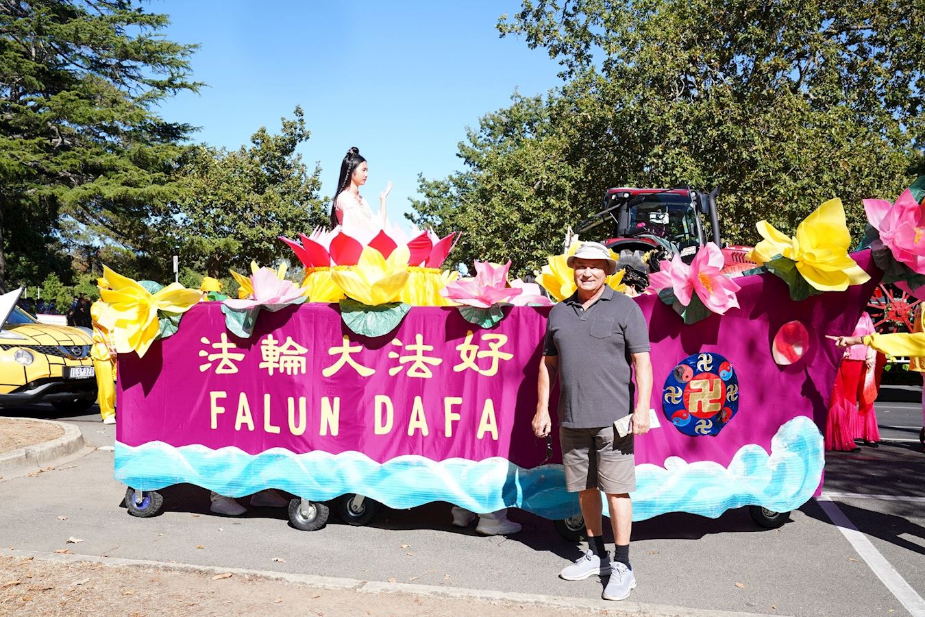 上午十一点,游行在植物园内的大道启动,两旁早已聚集了各年龄段的观众。法轮功团体是首次亮相,带来了法船、法轮功功法演示、仙女队、腰鼓队、扇子舞、舞龙和斗笠舞等精彩表演,服饰绚丽,气势非凡,成为游行队伍中的亮点。