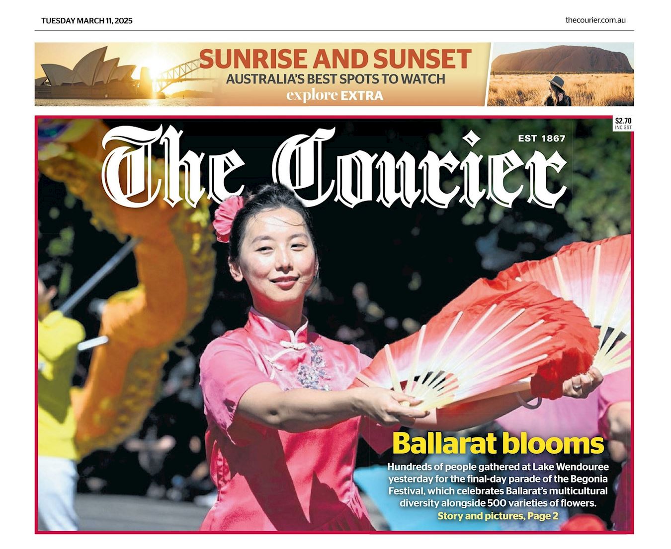 图10:二零二五年三月十一日,巴拉瑞特主要报纸《信使报》(The Courier)在头版刊登的游行图片展示了法轮功学员的扇子舞表演。(网站截图)