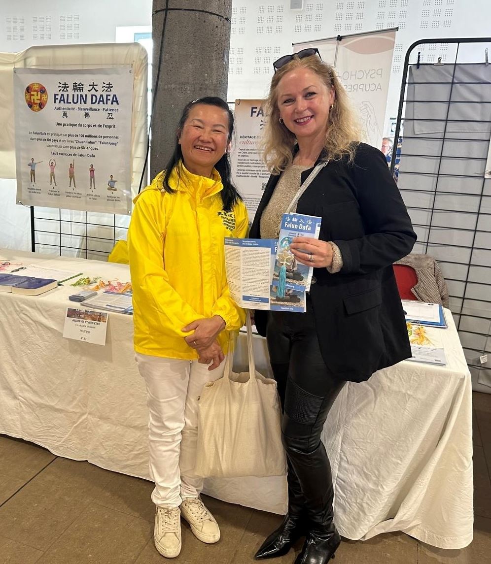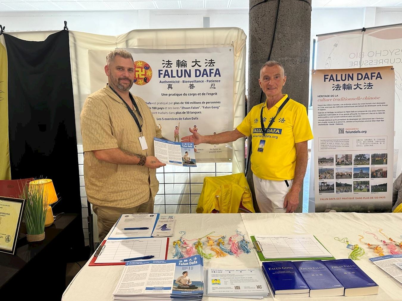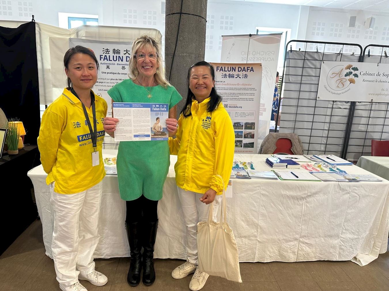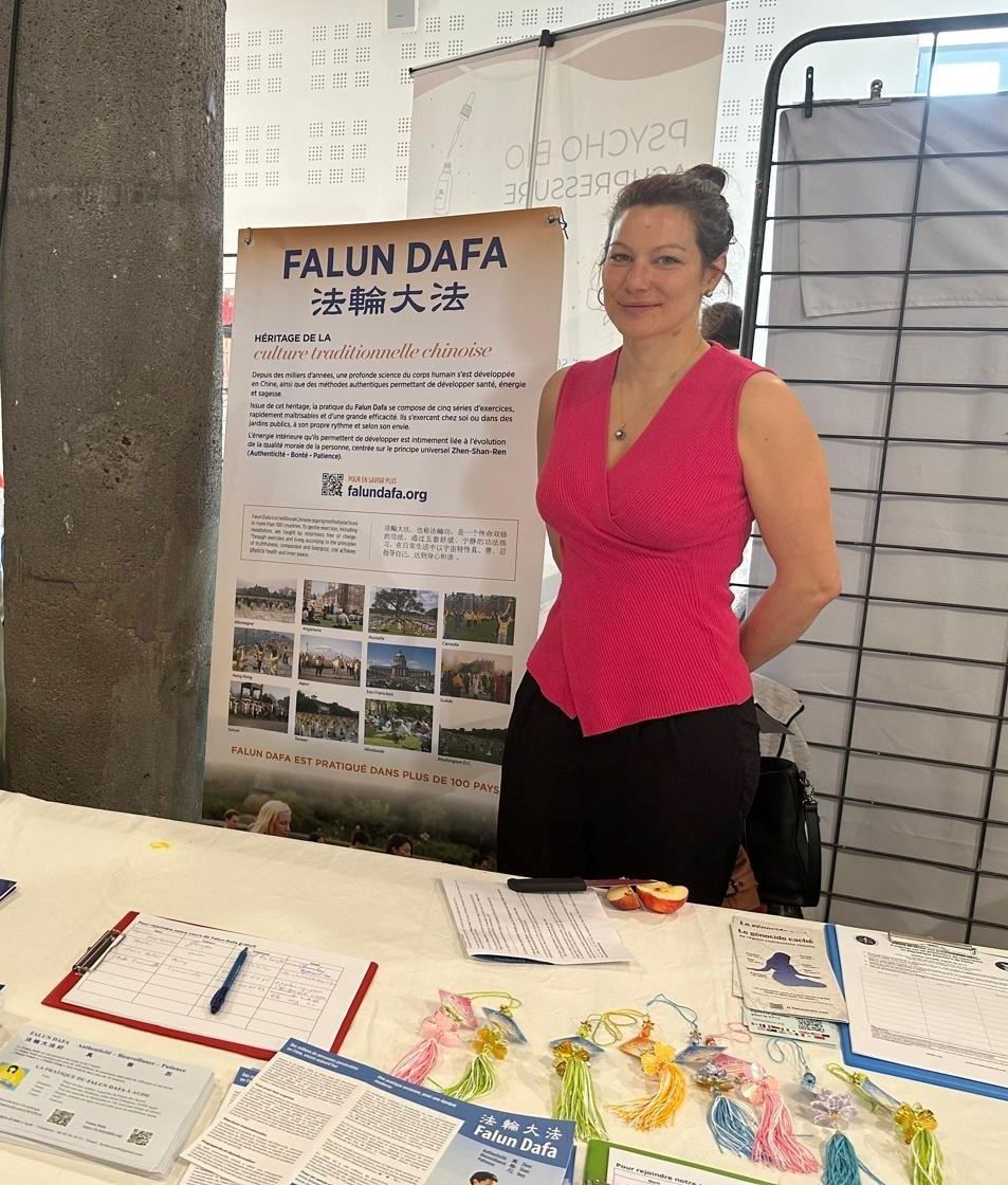 参展者米莱娜(Mylène)告诉学员,法轮功展位散发着纯净与简单的氛围,黄颜色也深深吸引了她。她希望能来到阿格德的修炼地点学炼五套功法。