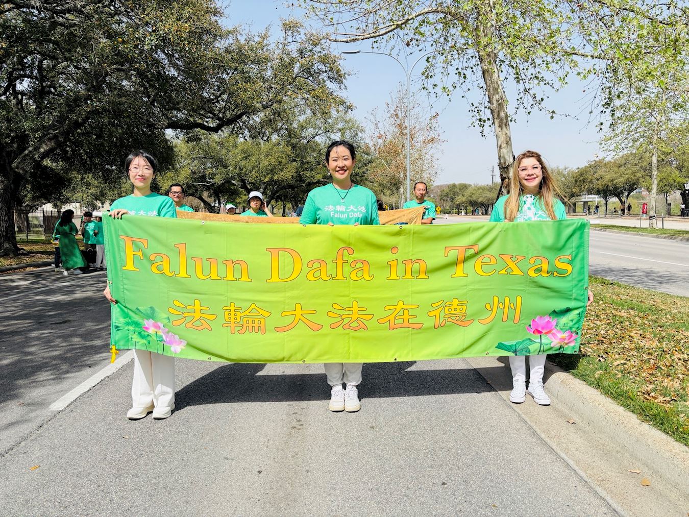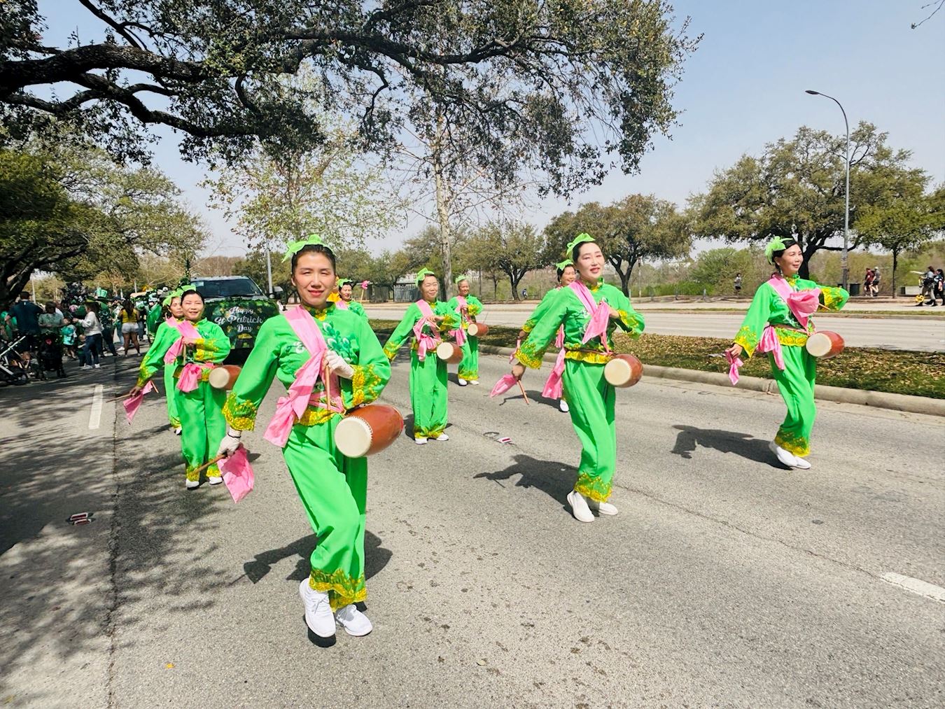 当天中午十二点,游行正式开始。法轮功学员是本次唯一的亚裔团体,他们精心装扮,个个身着绿色衣服或佩戴绿色饰物,喜气洋洋。打头阵的是真相横幅队,三面横幅分别以中英文书写“法轮大法在德州”、“法轮大法好”和“真、善、忍”,展示五套功法的花车紧随其后,腰鼓队演奏的《法轮大法好》、《喜庆》和《新中国进行曲》悠扬悦耳,振奋人心,现场洋溢着祥和与喜悦的气氛。
