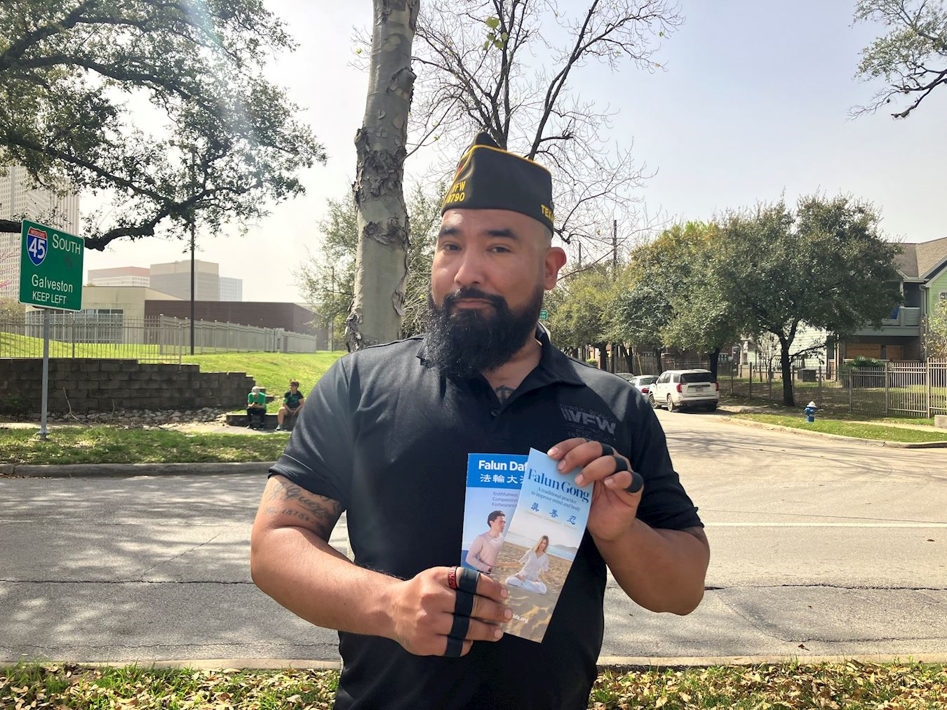 参与现场游行的团体和观众纷纷欢迎法轮功学员的参与。伊迪奥(Indio)先生隶属于海外战争老兵组织VFW(Veterans of Foreign Wars),这也是当天参加游行的团体之一。伊迪奥本人曾经在海外驻军,并长期在韩国、阿富汗等地服役。