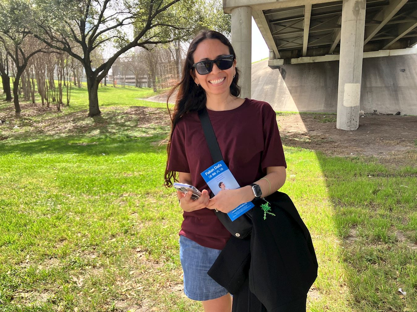维里迪亚娜(Viridiana)女士是从墨西哥来休斯顿的游客,当天在等回程的航班期间在市中心偶遇法轮功的游行队伍,学员赠送给她一朵绿色小莲花,她欣然接过,并挂在左手臂上。