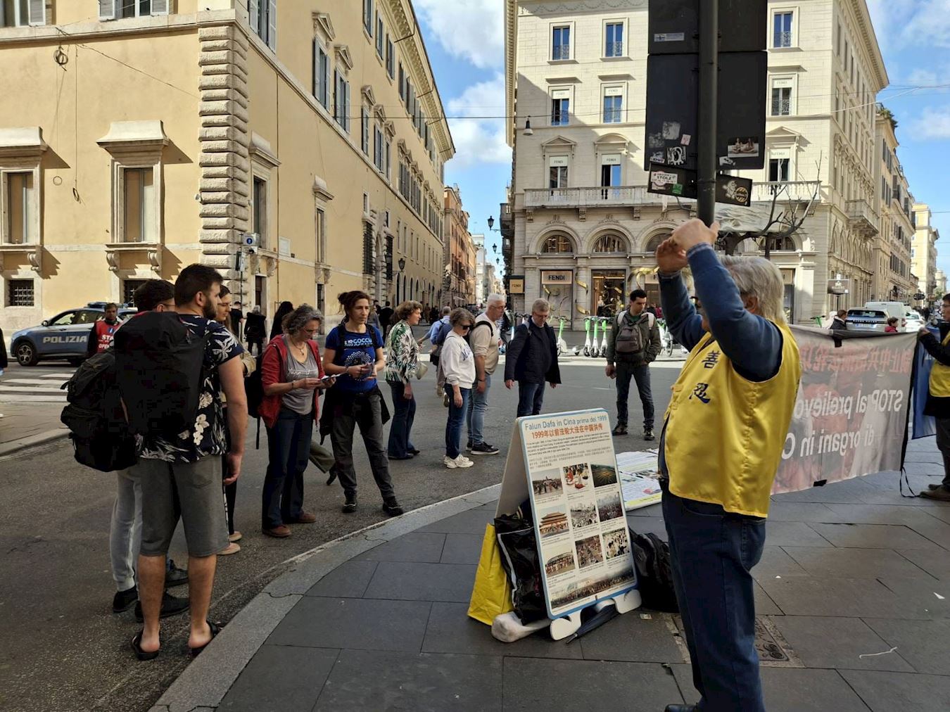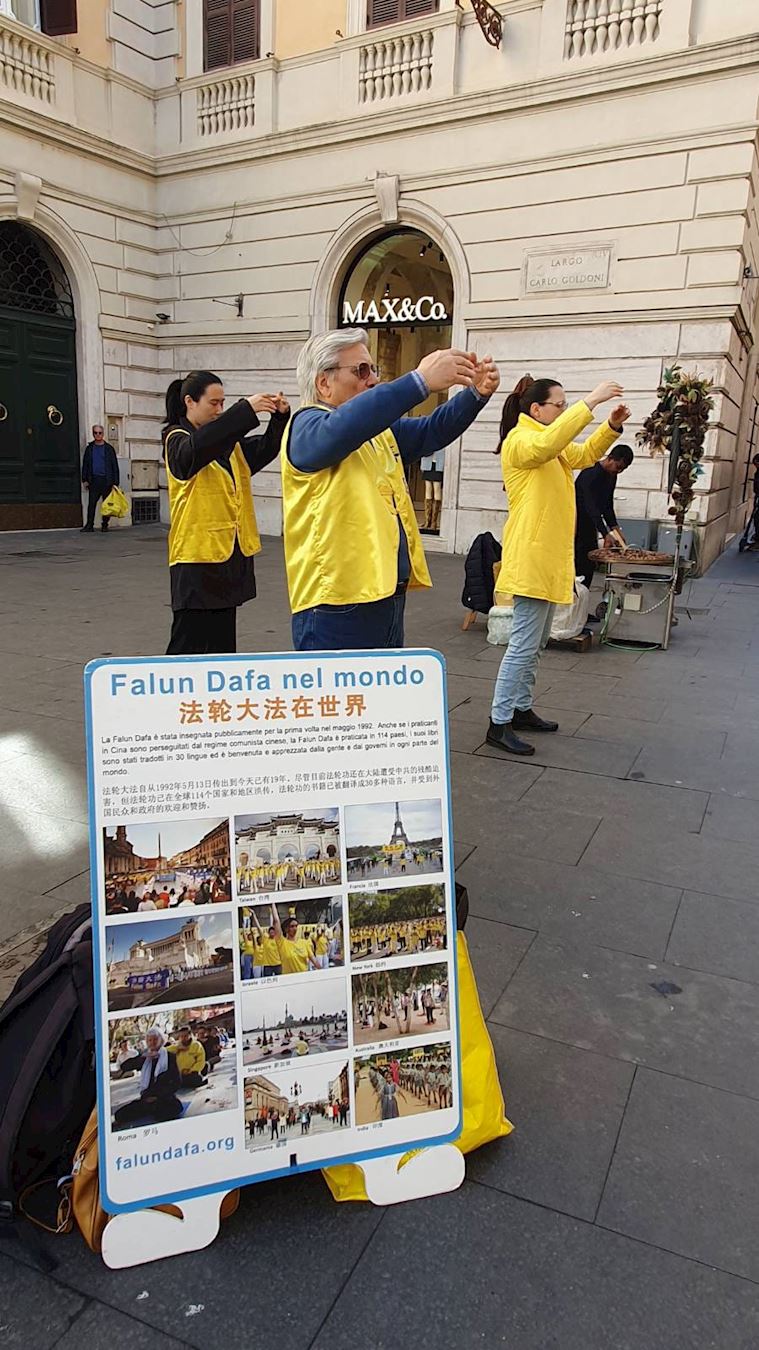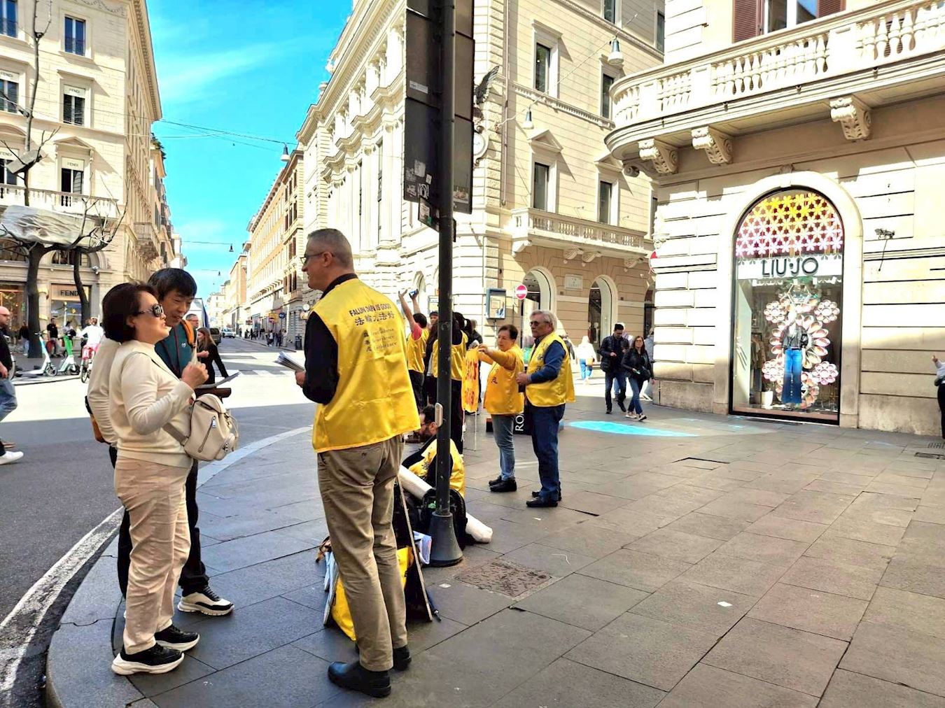 二零二五年三月十五日星期六,罗马法轮功学员在罗马历史中心的主要街道之一,著名的科尔索大街(Via del Corso)的哥尔多尼广场(Largo Goldoni)举办了讲真相活动。