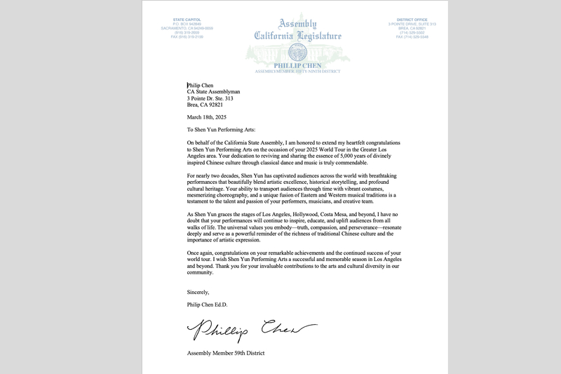 ![]() 图5:美国加州59区州众议员陈立德(Phillip Chen)代表加州议会发贺信欢迎神韵再次莅临。(大纪元) |
